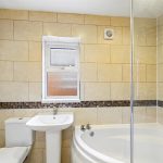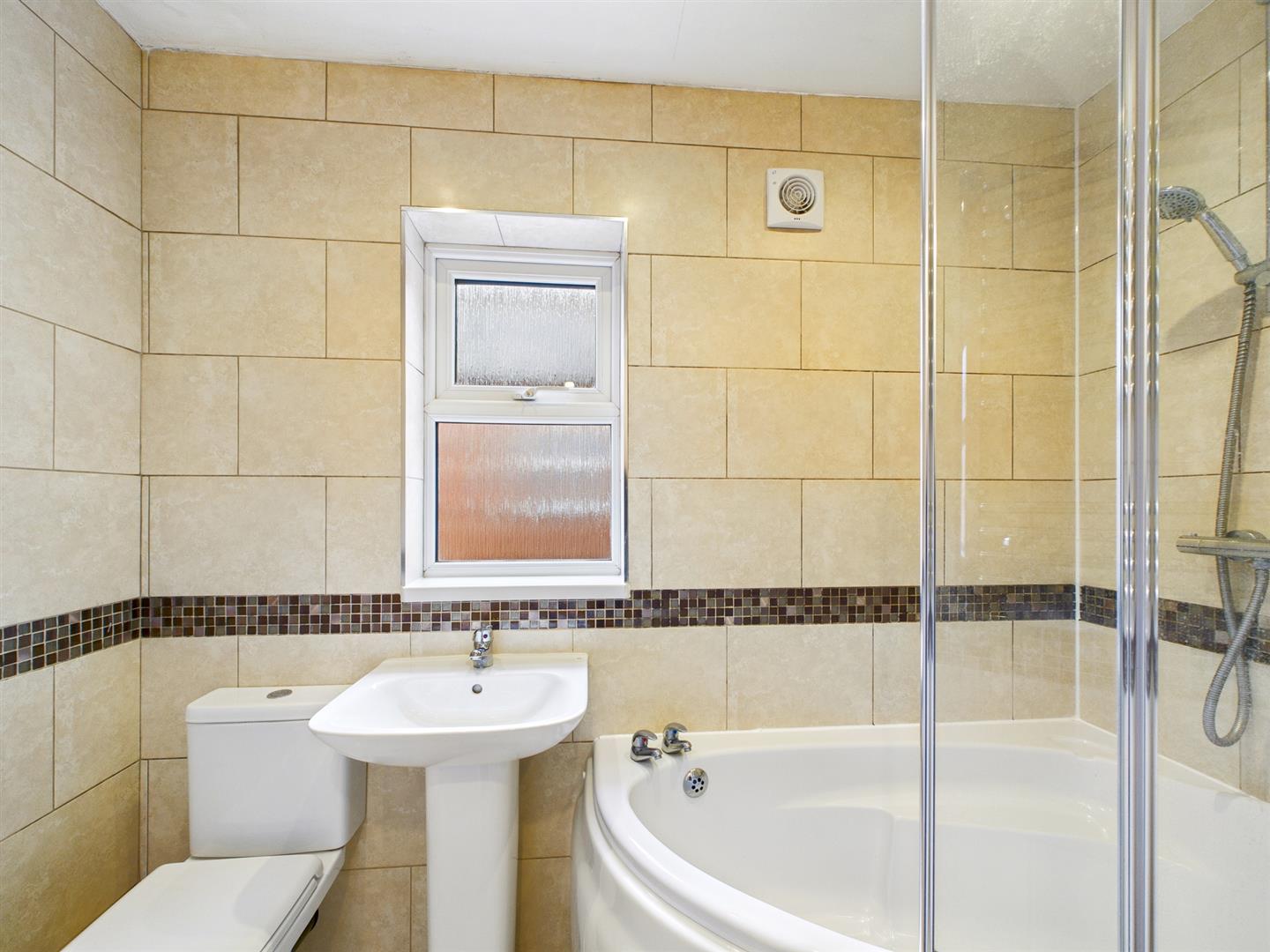 White suite comprising corner bath with shower over, low level WC and wash hand basin. Heated towel rail, extractor fan, spotlight, tiles to floor and walls and window to the side.