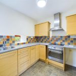 Fitted with a range of wall and base units with work surfaces over, inset sink with mixer tap and drainer, integral oven and hob with extractor hood above. Window to the side and rear elevation, ceiling light, tiled splash back and vinyl flooring. Door into;