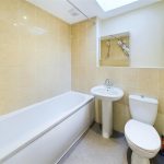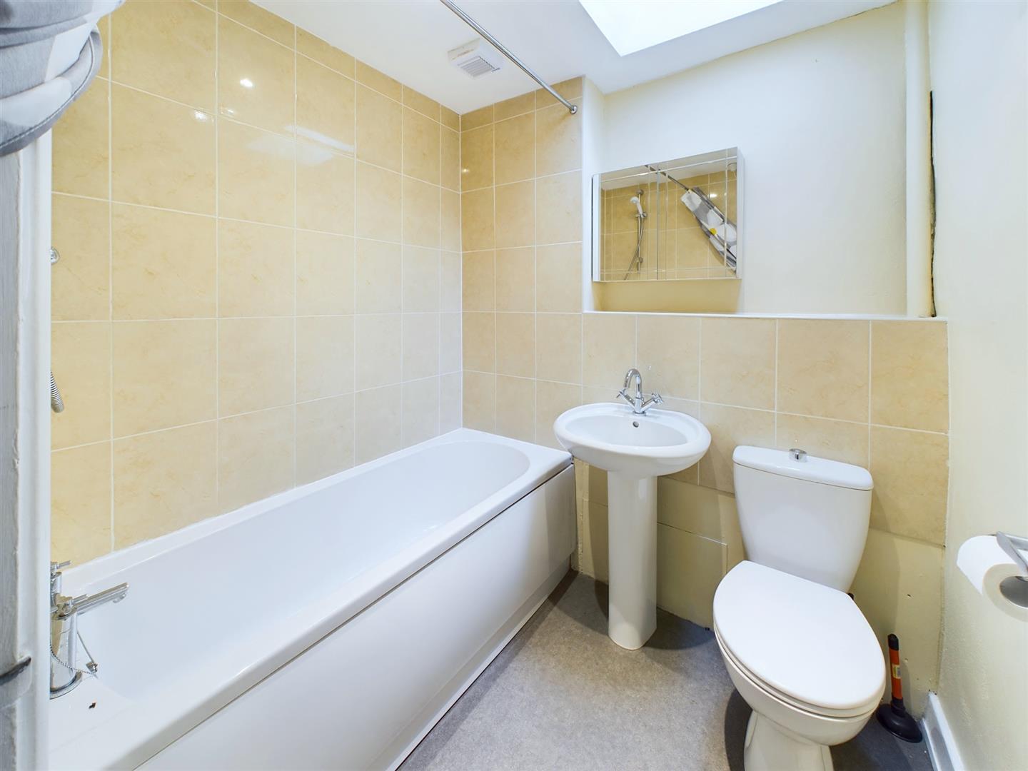 White suite comprising panelled bath with shower over, WC and wash hand basin. Spot lighting, heater fan and sky light.