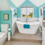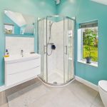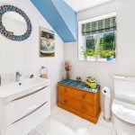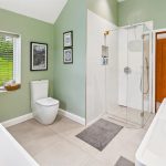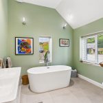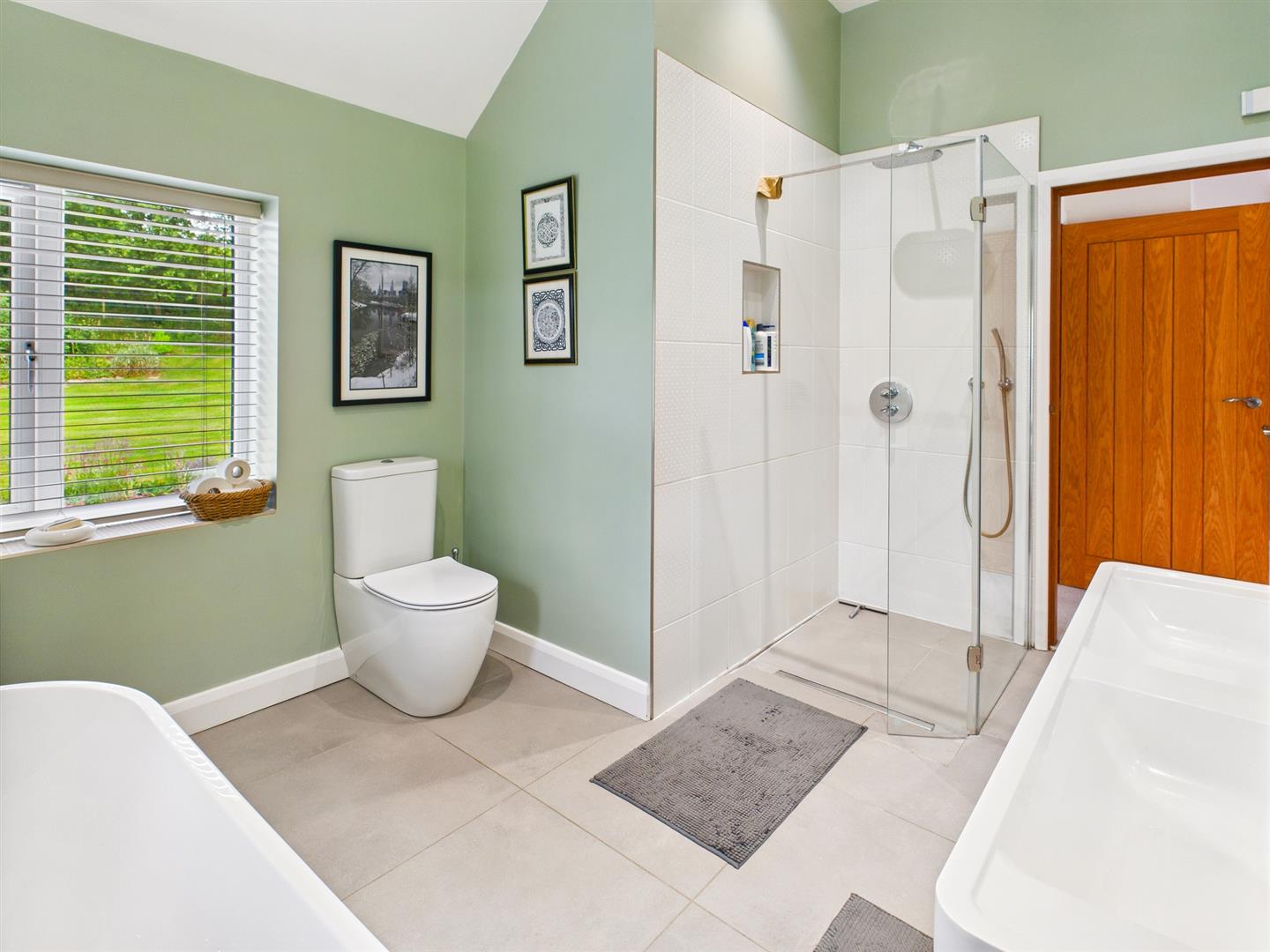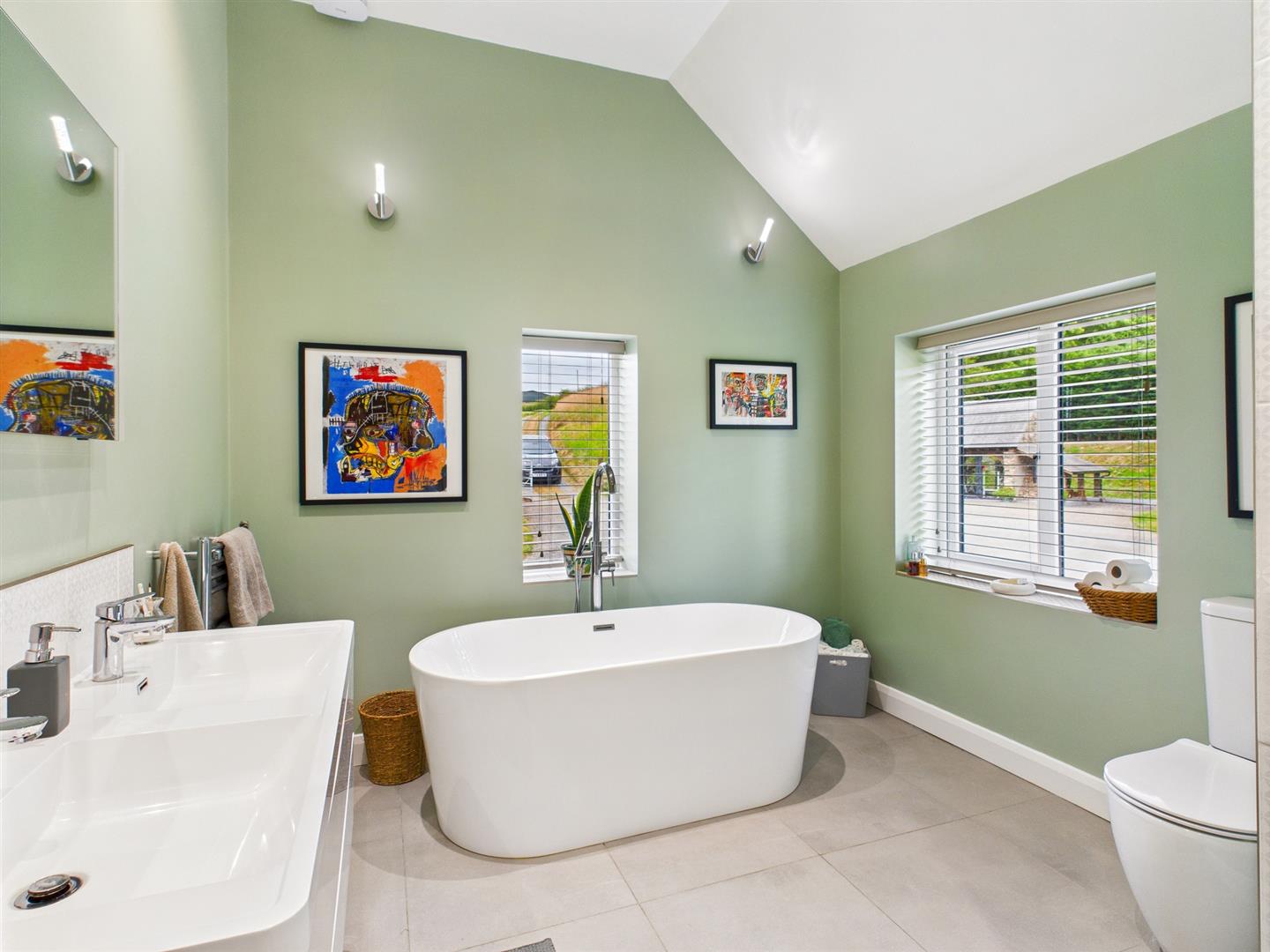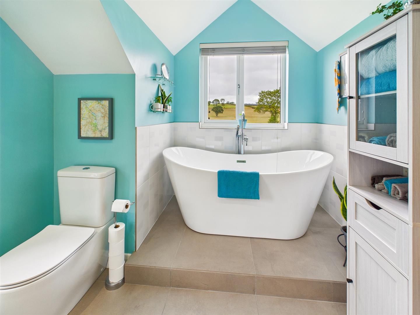 Low level WC, vanity wash basin with ‘Grohe’ tap and drawers below, shower cubicle with wall mounted ‘Grohe’ shower, free standing bath with central mixer tap and shower attachment, dual aspect with stunning far reaching views, heated towel rail, tiled floor and extractor fan.