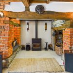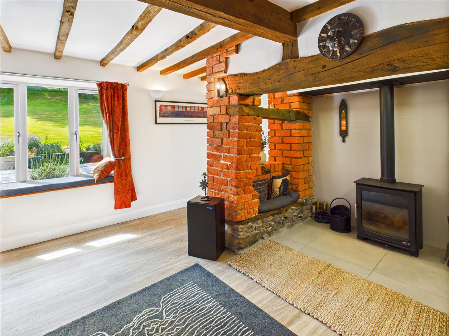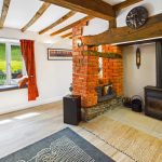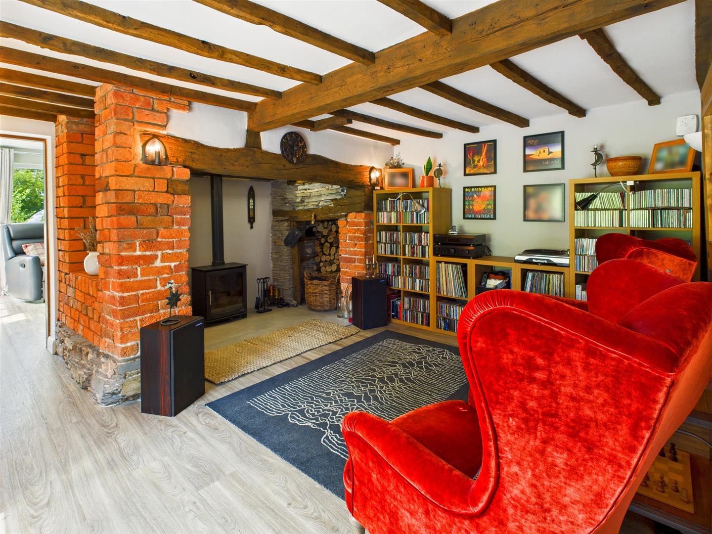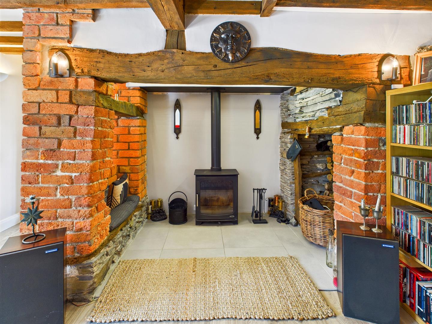 Feature Inglenook fireplace with tiled hearth, wood beam and wood burning stove, window overlooking the front gardens with a window seat.