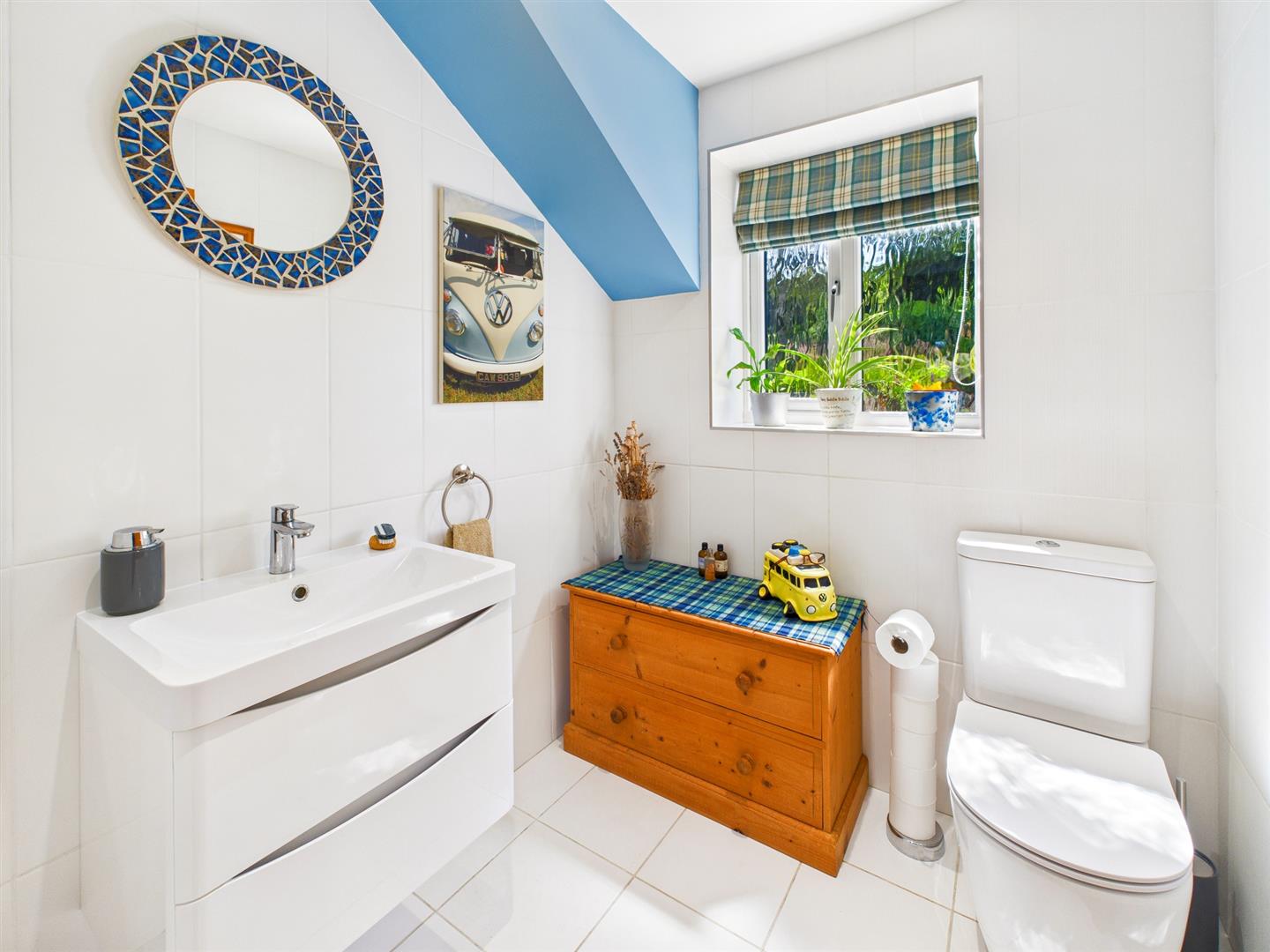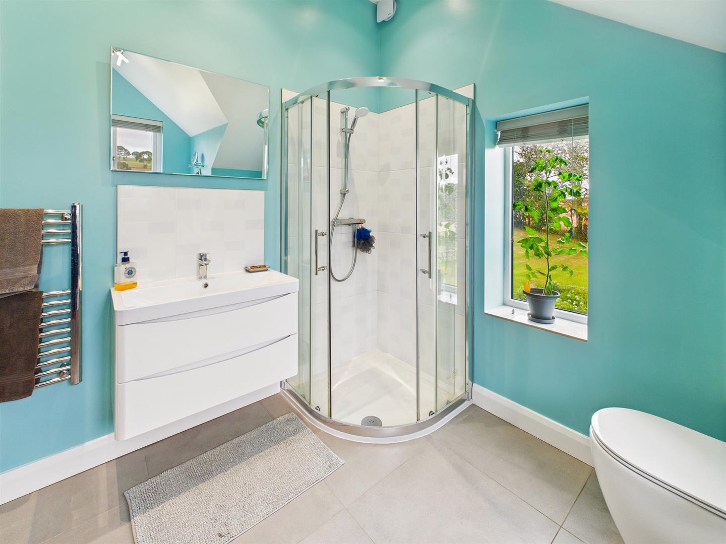 Low level W.C., twin wash basins with ‘Grohe taps and storage drawers below, walk-in shower cubicle with twin heads, free standing bath with mixer tap and shower attachment, tiled floor, extractor fan, heated towel rail, provision for electric mirror and windows to the front and side.