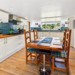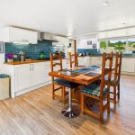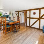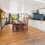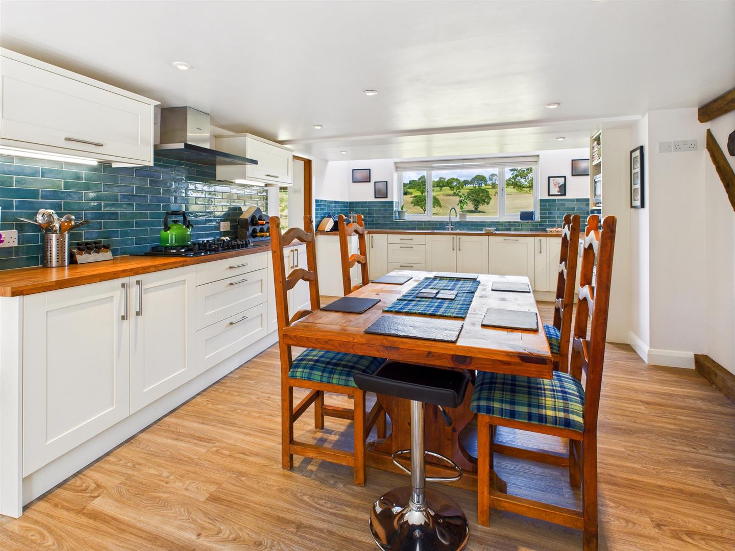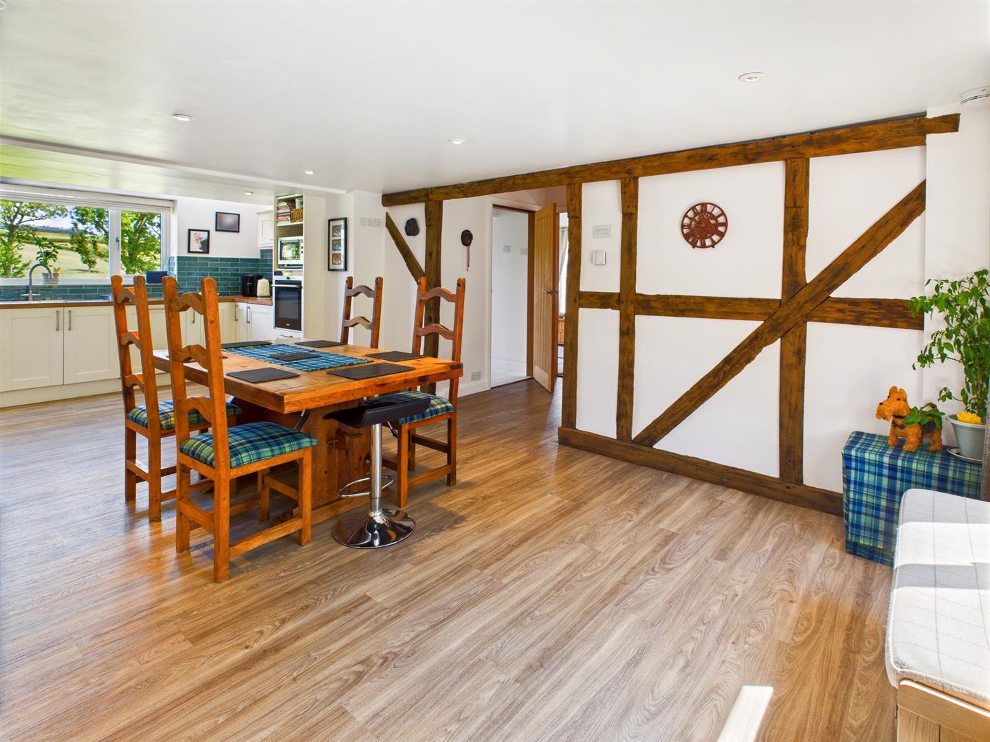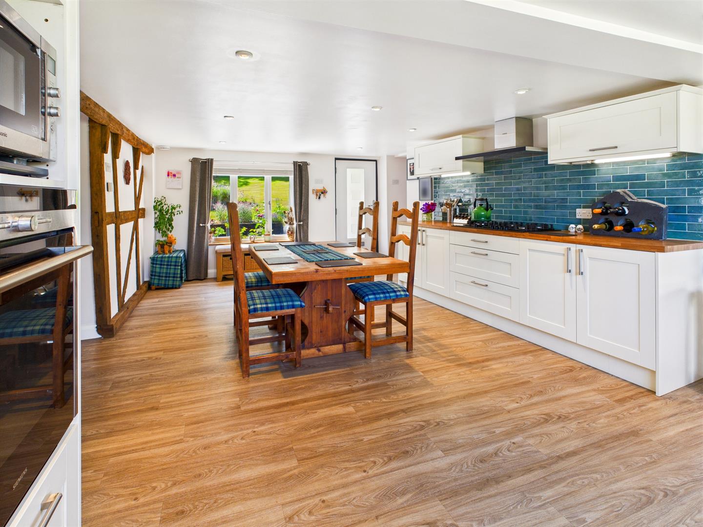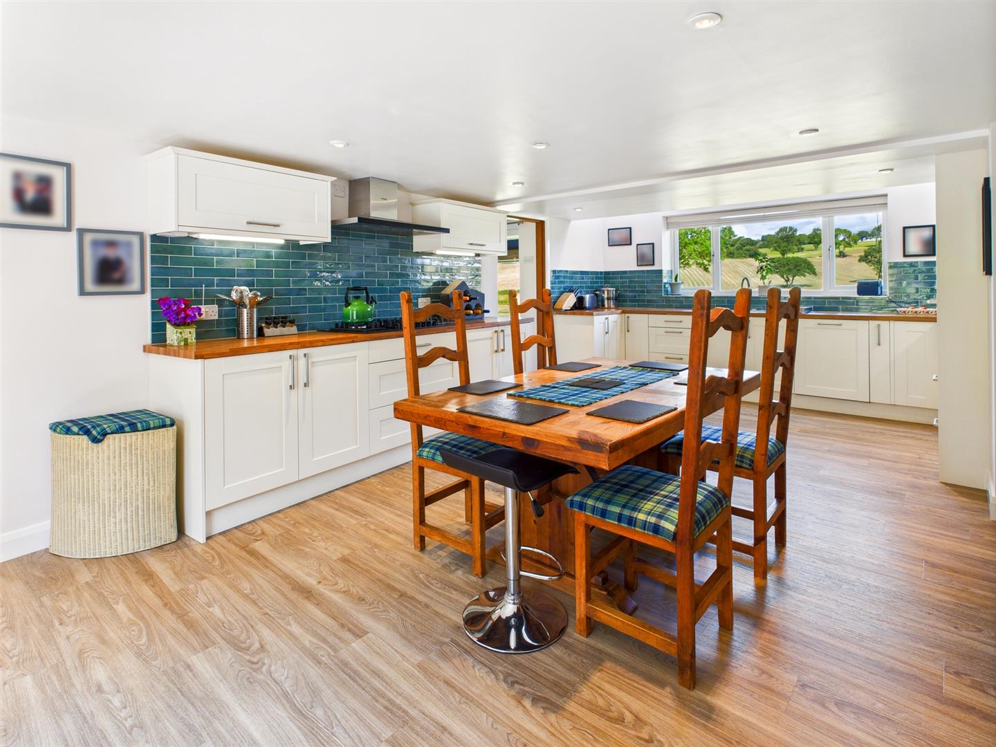 Fitted with an extensive range of modern base cupboards and drawers with wooden work surfaces over, matching eye level cupboards with lighting under, stainless steel Franke sink and drainer with mixer tap, Italian porcelain wall tiles, a range of integrated appliances: ‘Siemens’ five ring gas hob with extractor over, oven with provision for warming drawer, dishwasher, fridge, space for microwave. Storage cupboard with manifold for downstairs under floor heating, ‘LVT by artist’ flooring, dual aspect with windows to the front and rear with stunning far reaching views of distant countryside, exposed beams and door to: