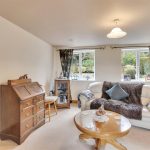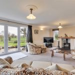 With windows and French doors overlooking rear garden and views beyond. Radiator and log burner set on slate hearth.
