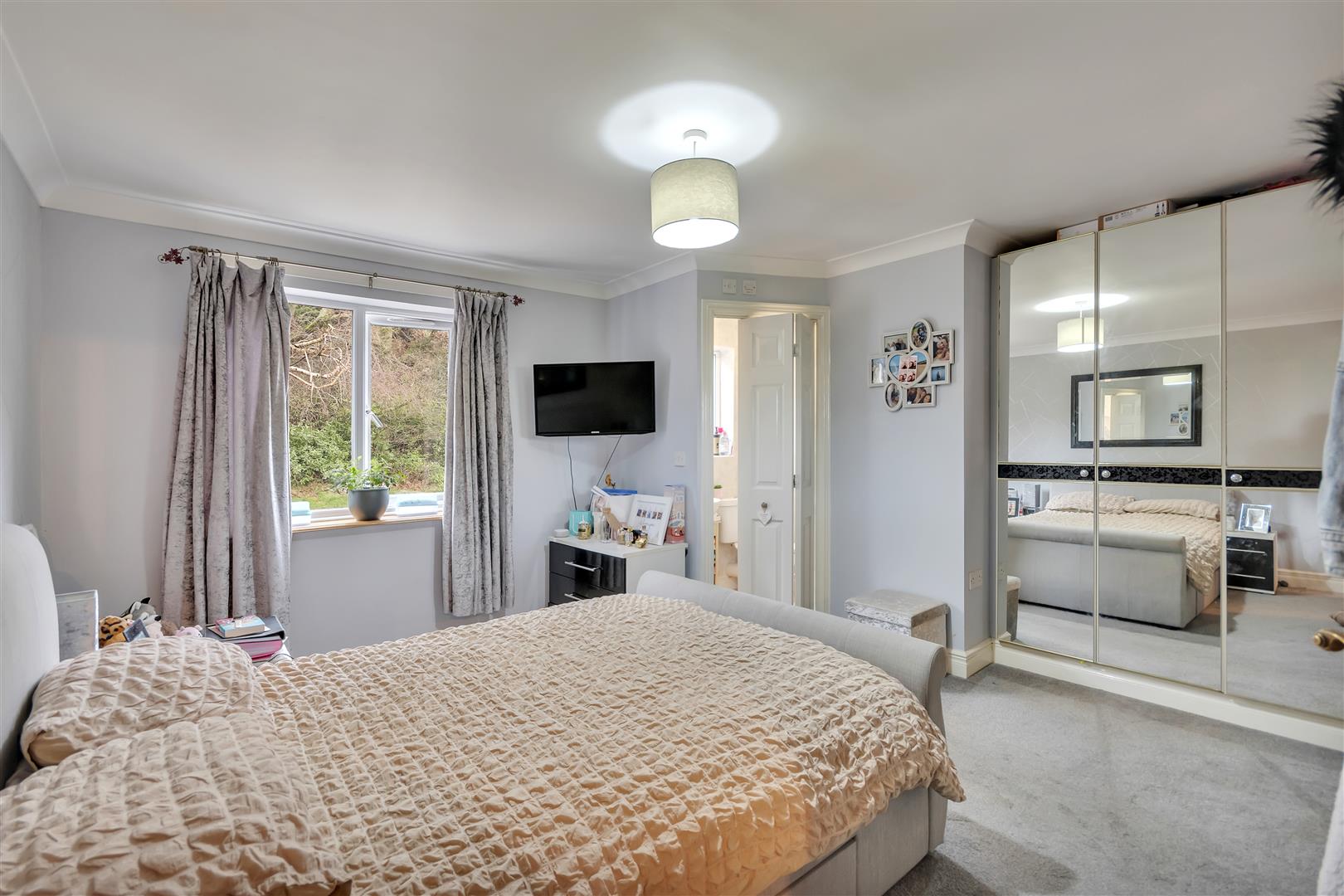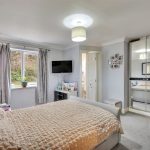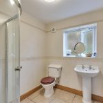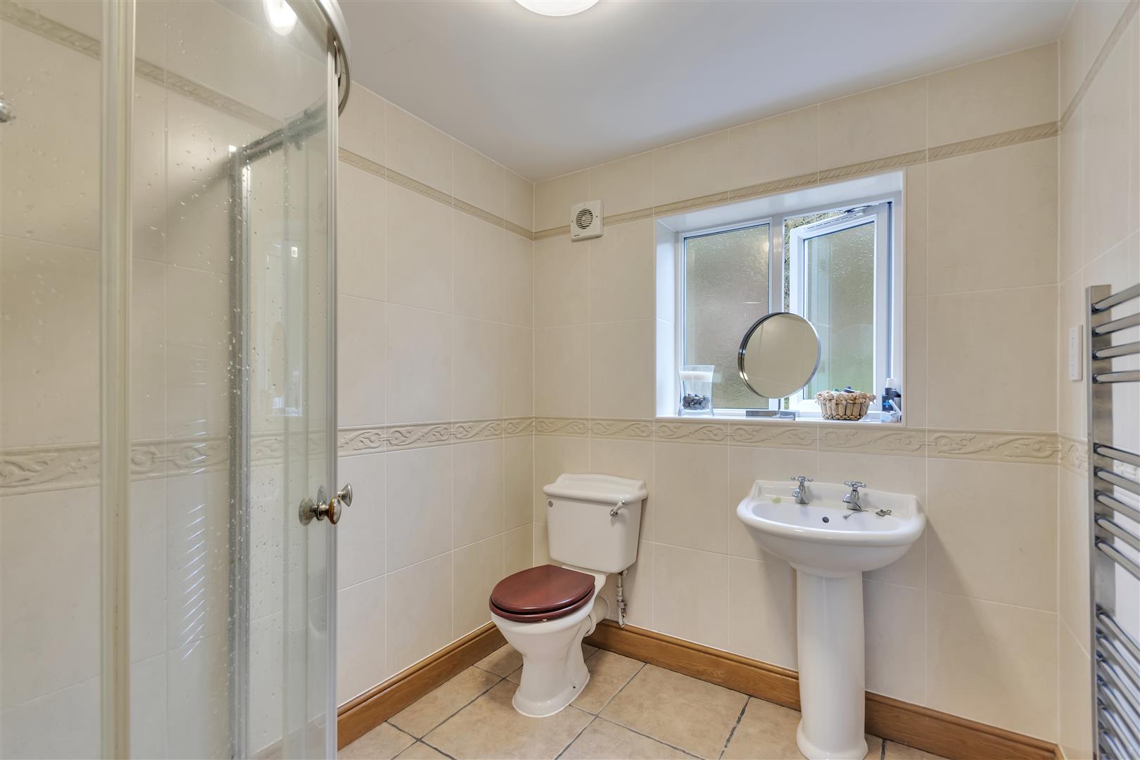 With suite comprising fully tiled shower cubicle, wash hand basin and WC. Heated towel rail, window to the front and complementary tiled surrounds.