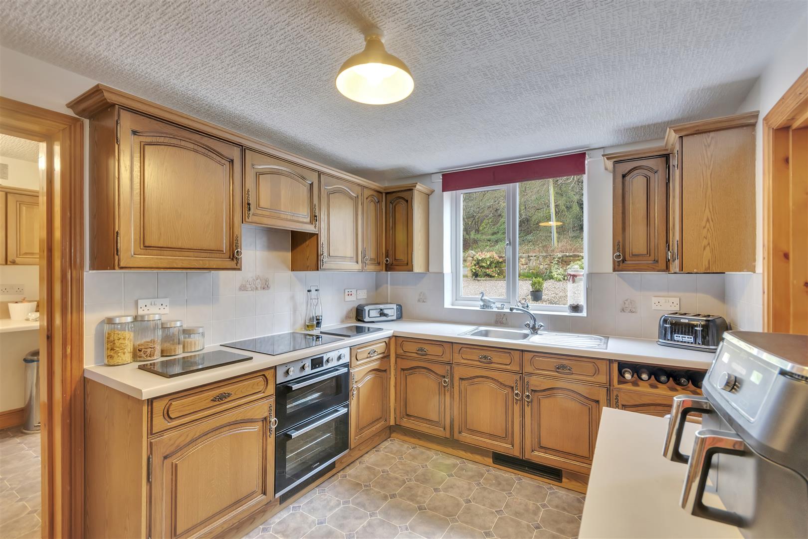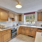 Comprehensively fitted with range of wooden fronted units incorporating single sink unit with mixer taps set into base cupboard. Further range of matching base units comprising cupboards and drawers with work surfaces over and double oven with hob above and extractor. Matching range of eye level wall units and display units, tiled flooring, window to the front. Breakfast bar area, radiator, glazed door to