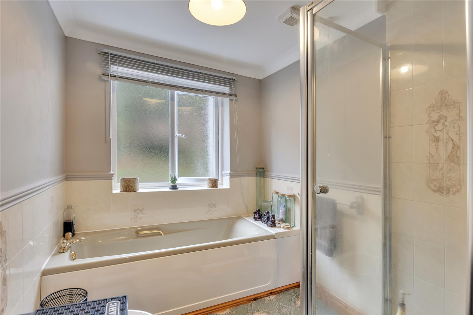 With suite comprising panelled bath with separate shower unit, bidet, wash hand basin and WC. Complementary tiled surrounds, radiator, window to the front.