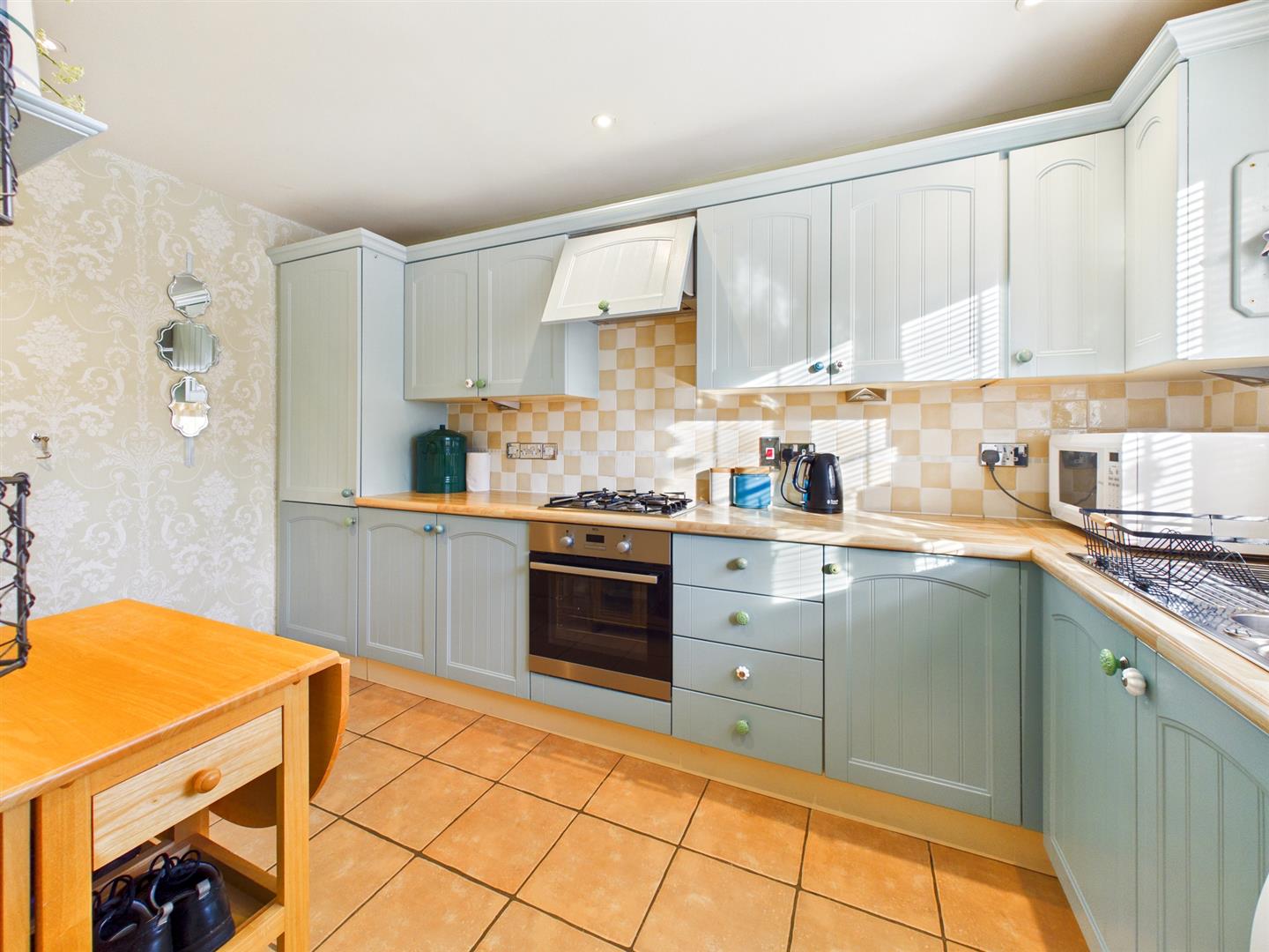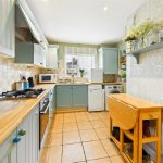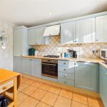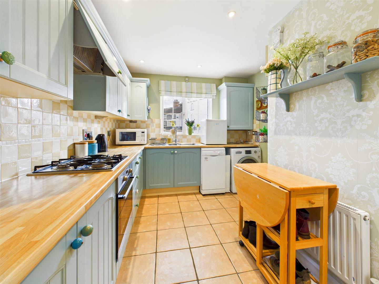 With tiled floor with a front aspect window, built-in base and wall units with laminated worktops and tiled splashbacks, integrated appliances include a one-and-a-half bowl stainless steel sink with draining space, a four ring gas hob with electric oven below and fridge/freezer. Space and plumbing for washing machine and dishwasher.