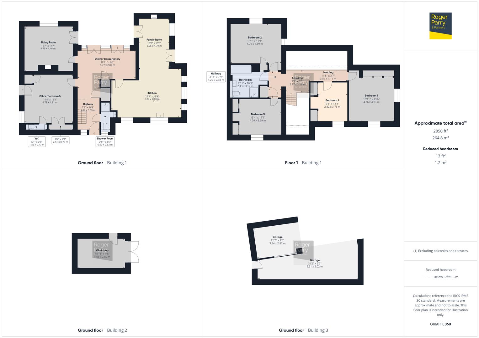 The accommodation briefly: Entrance porch, shower room, conservatory, Sitting room, Kitchen/family room, Office/bedroom 5, cloak room, landing, four bedrooms, bathroom. Externally, there is twin open fronted garage, a single garage, large garden and driveway parking.