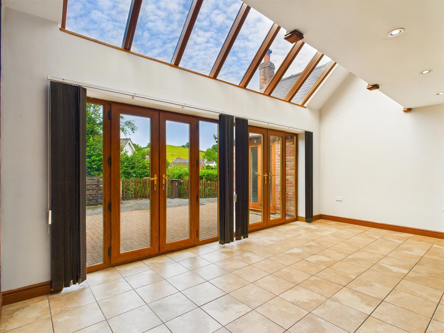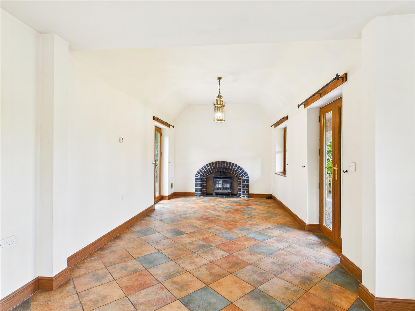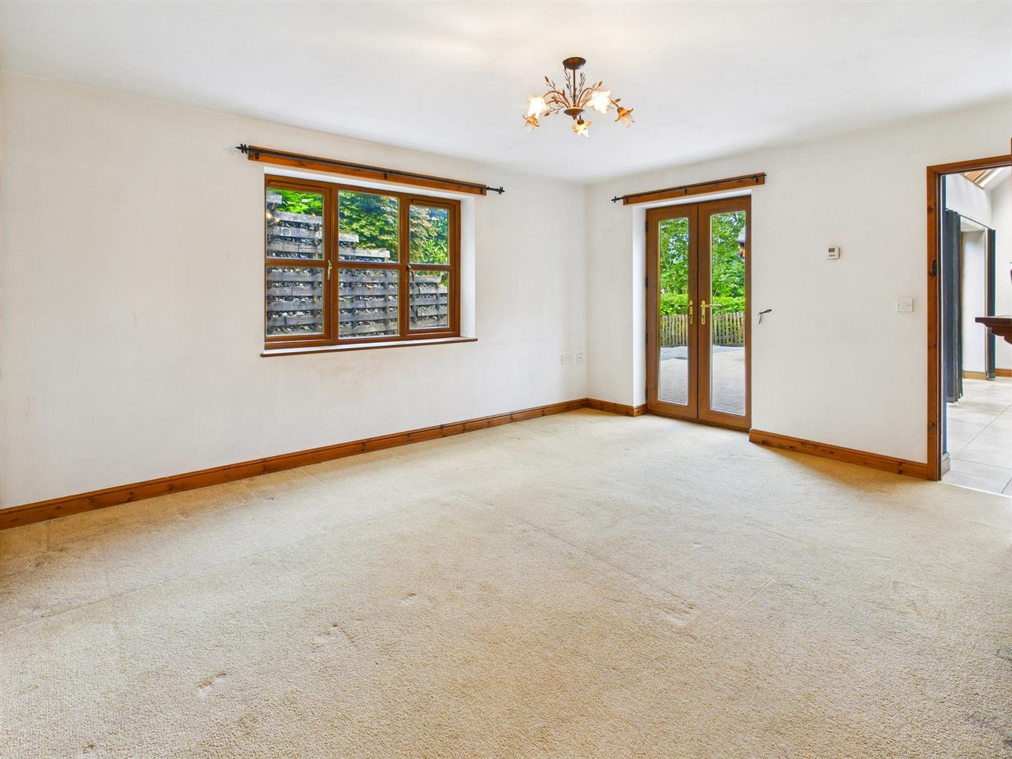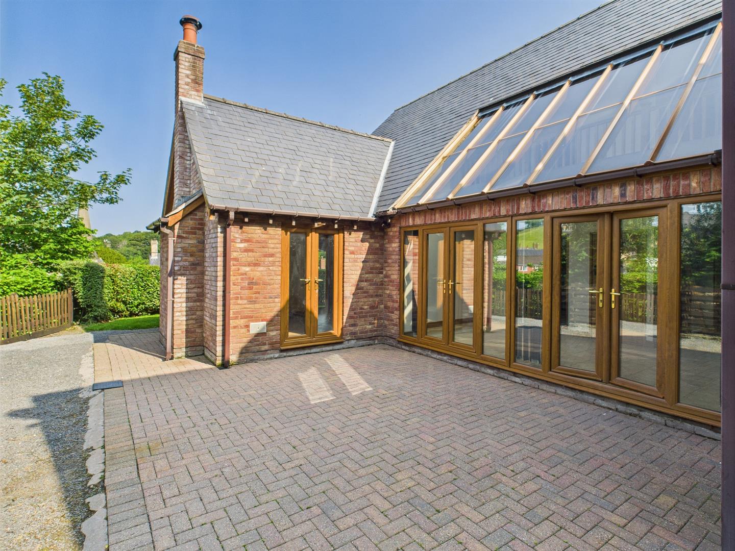 Double glazed full height vaulted glass roof, 2 French doors and side screen leading out to the rear patio and gardens and built in cloaks cupboard.