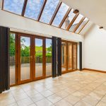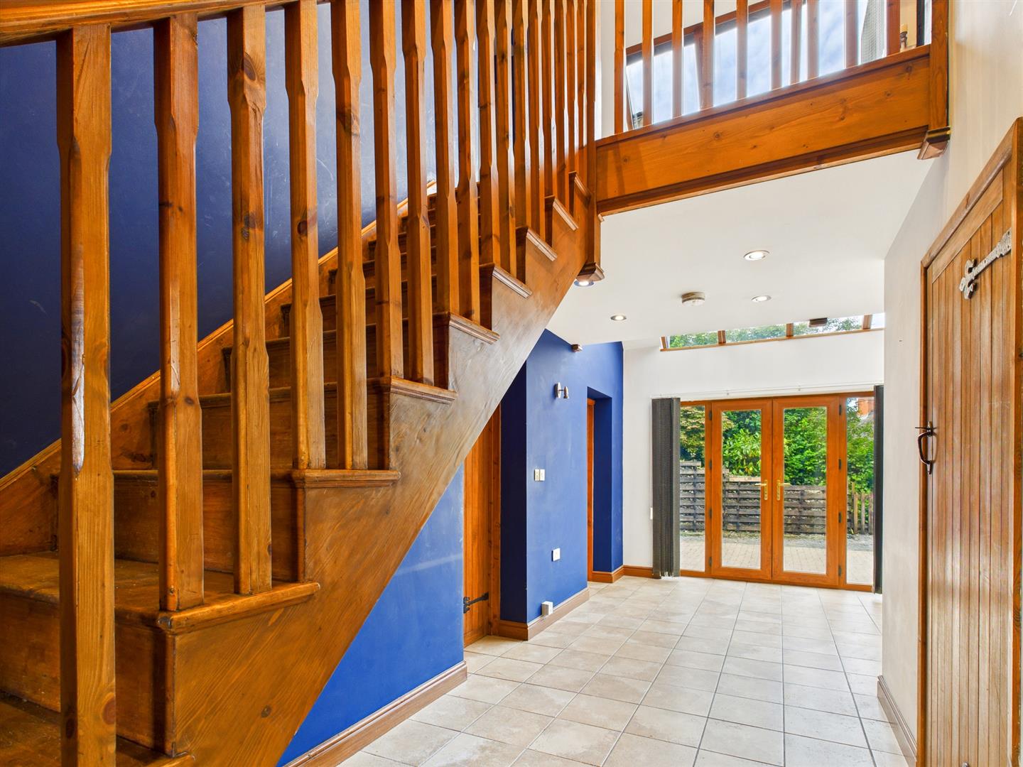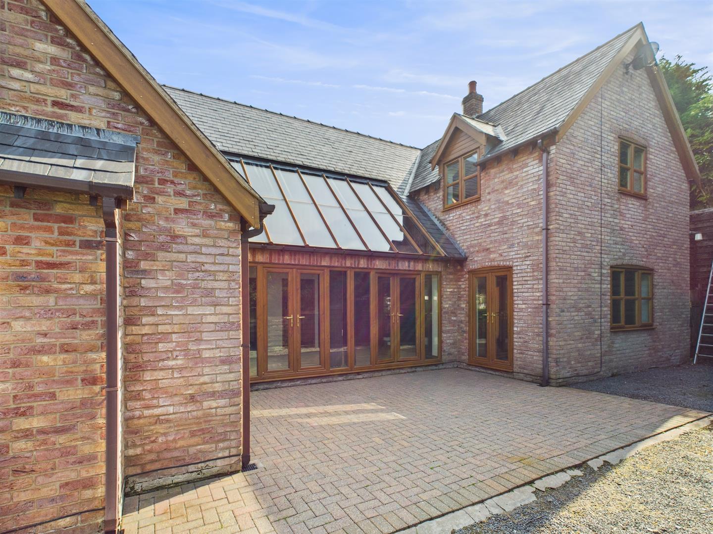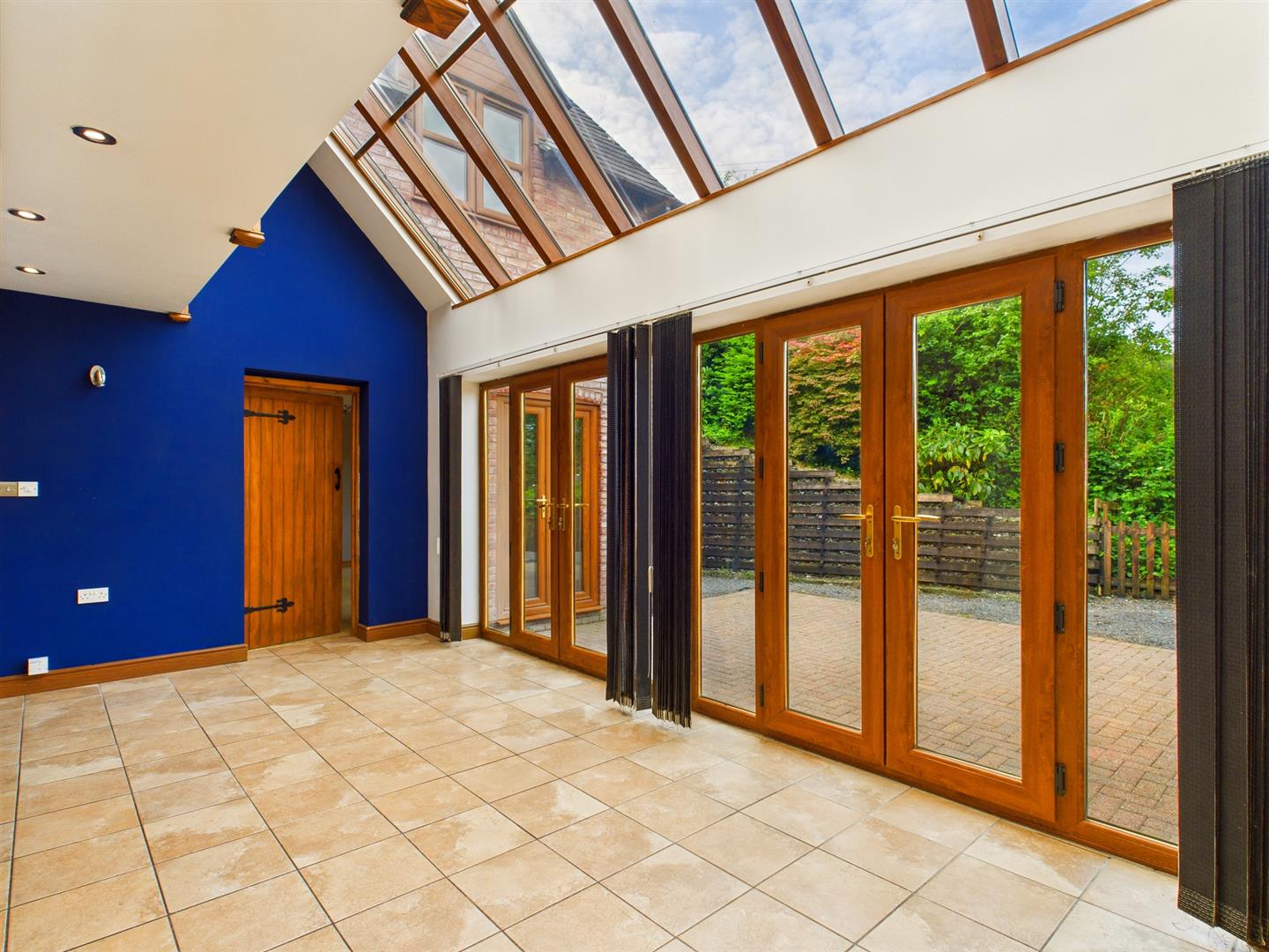 Double glazed full height vaulted glass roof, 2 French doors and side screen leading out to the rear patio and gardens and built in cloaks cupboard.