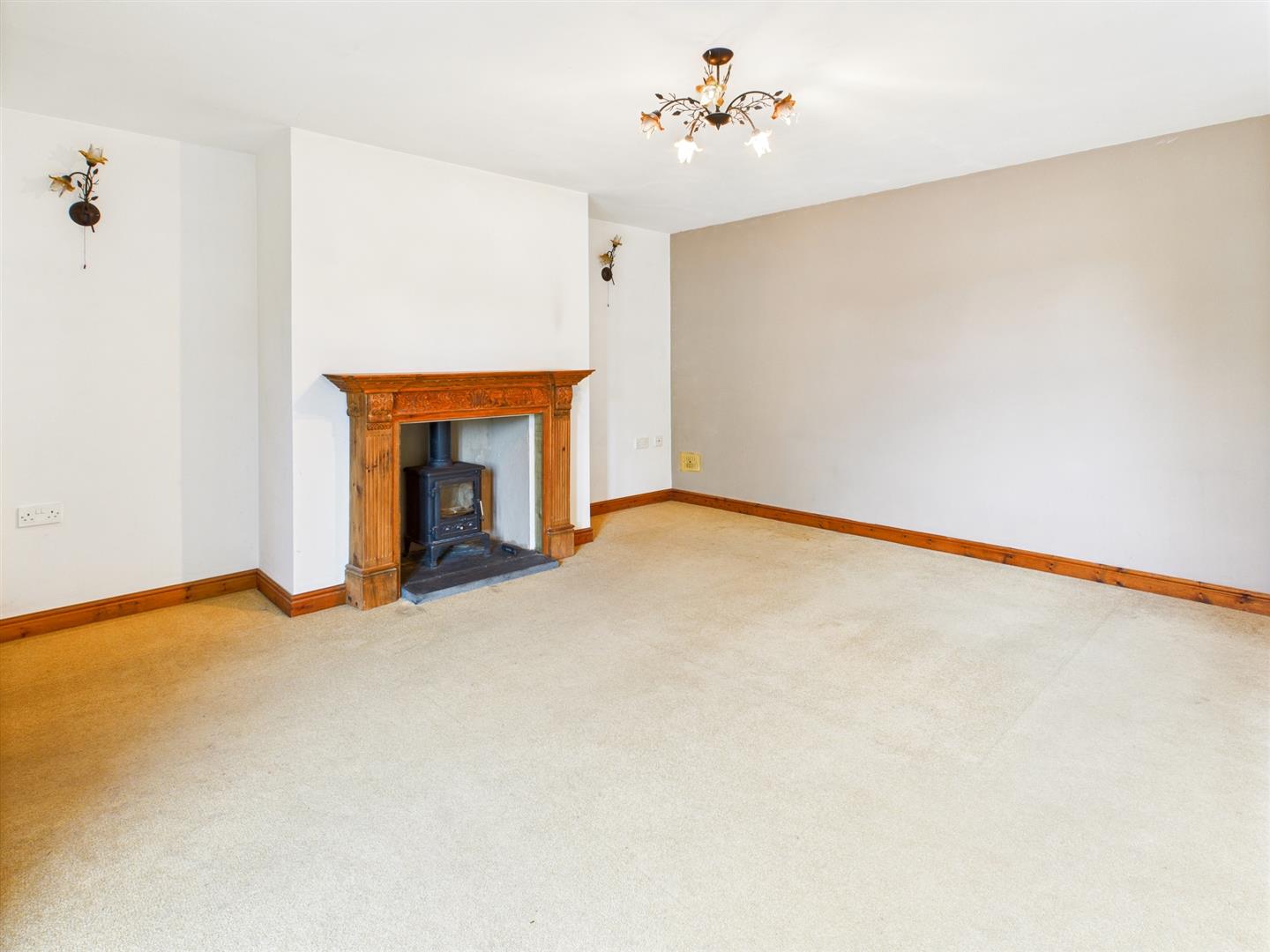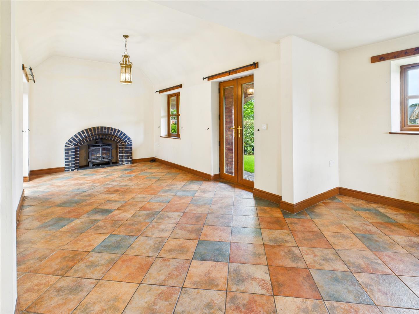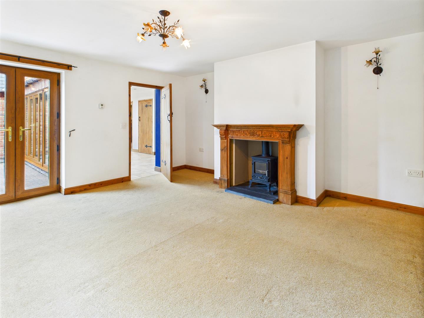 Dual aspect with windows to the rear and French doors to the patio and gardens and wooden fire surround with slate hearth and inset log burner.