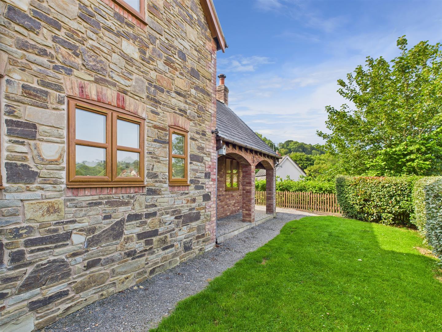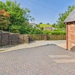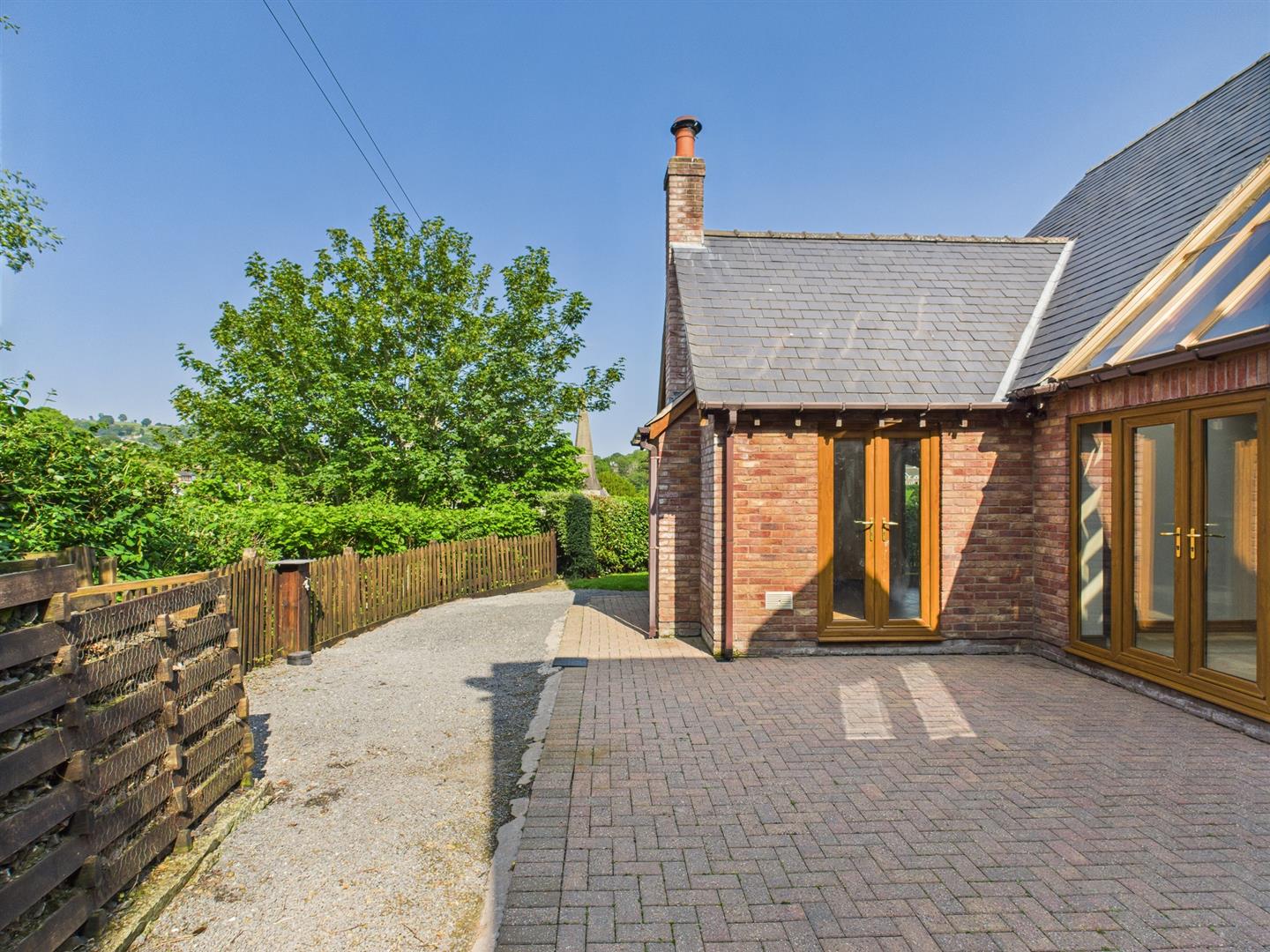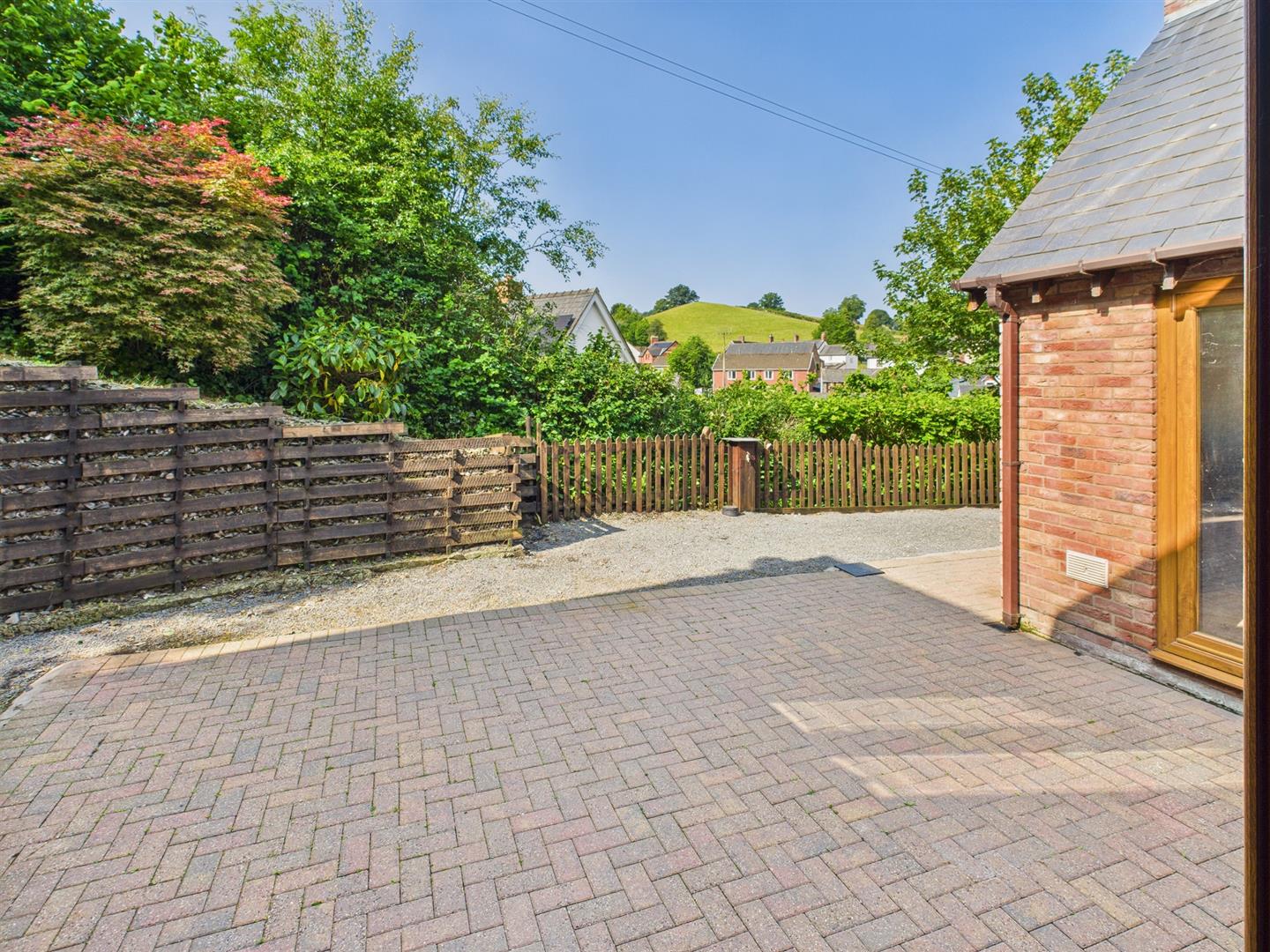 Patio entertainment area with gravel path leading to the side which is mainly laid to lawn with a gate to the front.