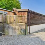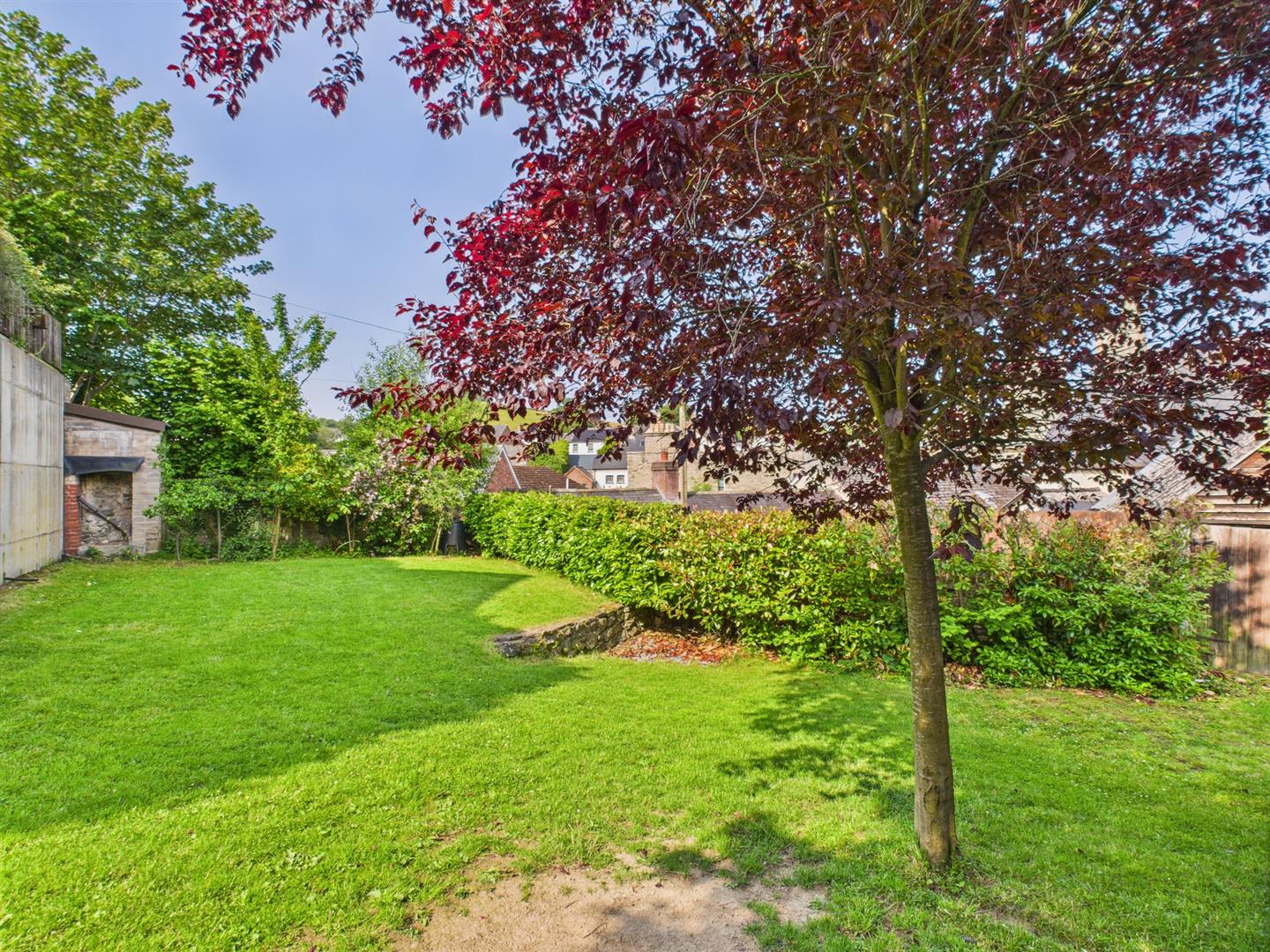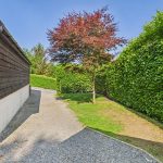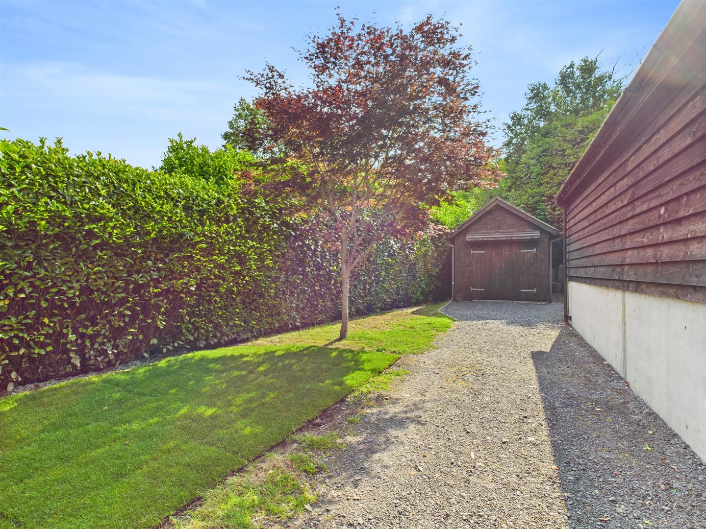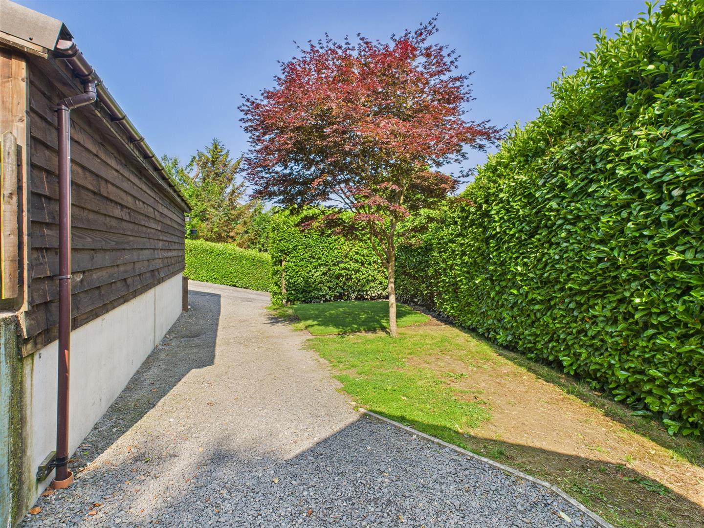 Patio entertainment area with gravel path leading to the side which is mainly laid to lawn with a gate to the front.