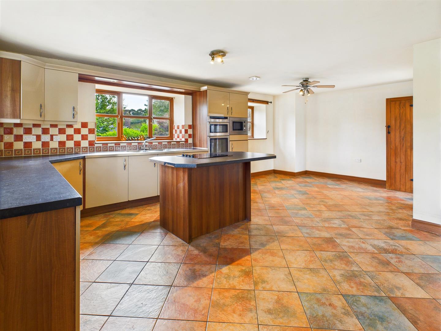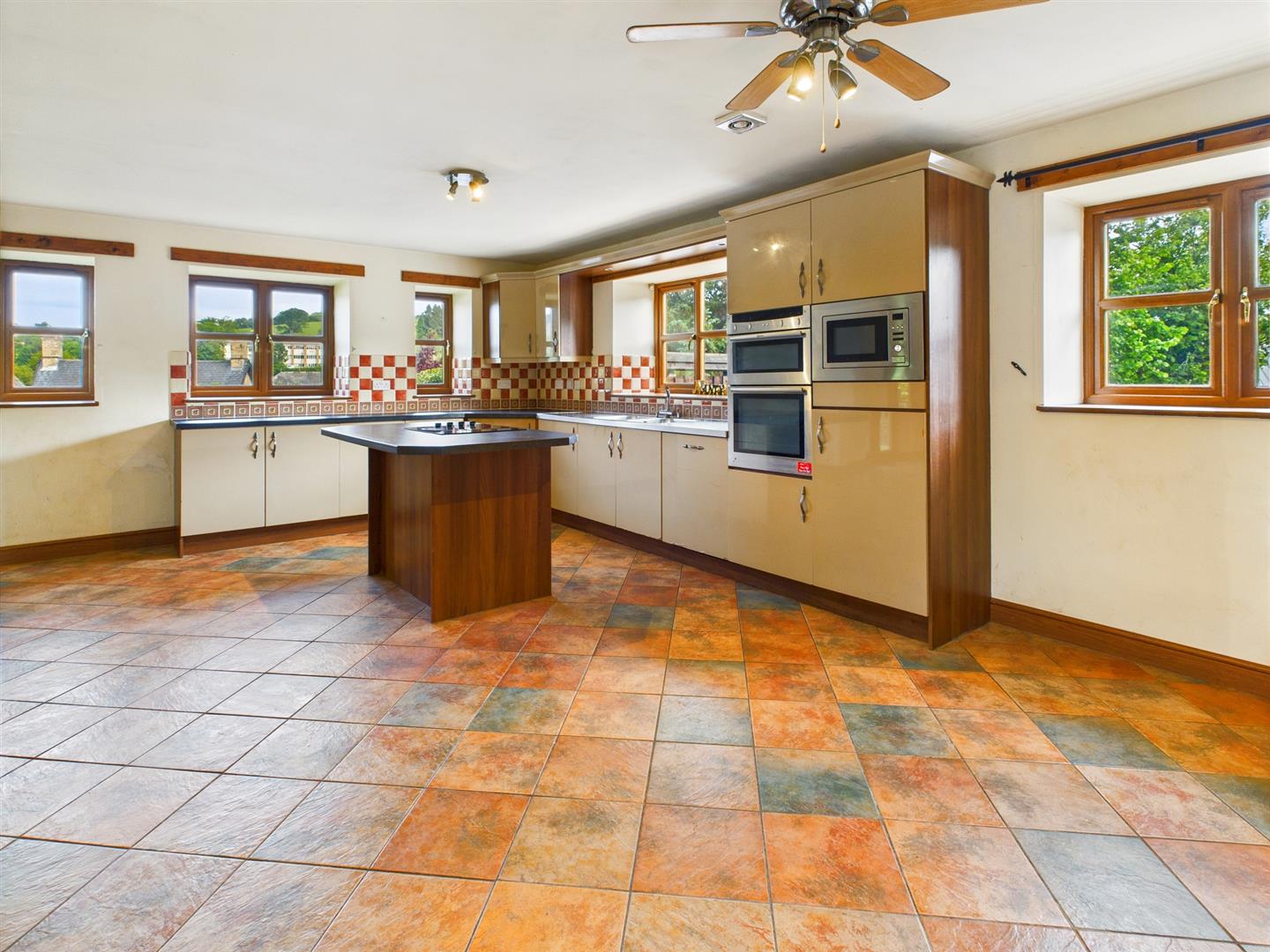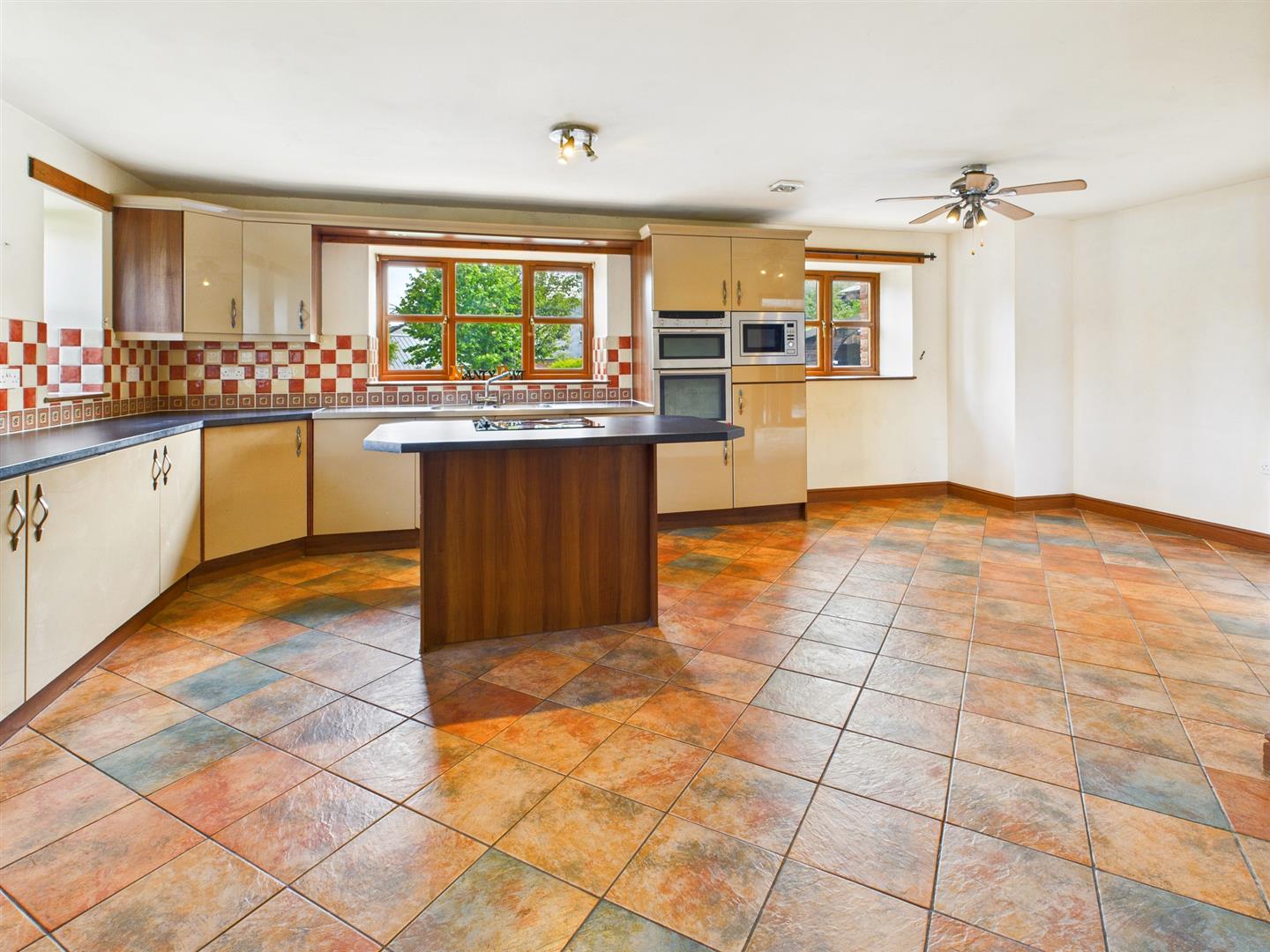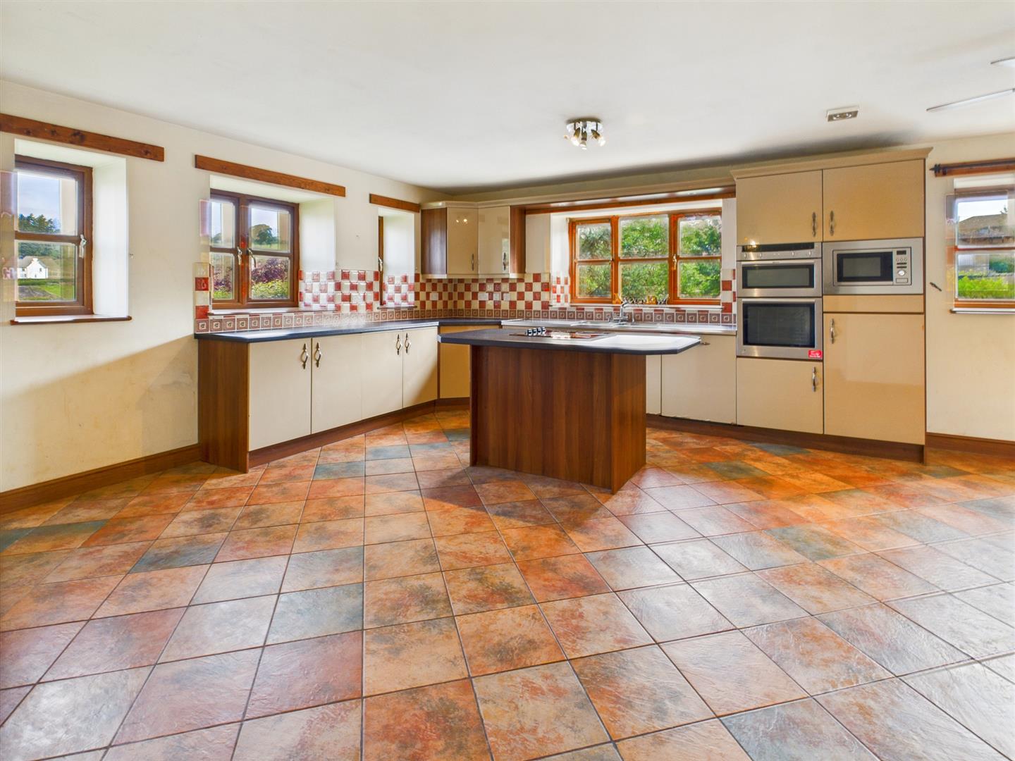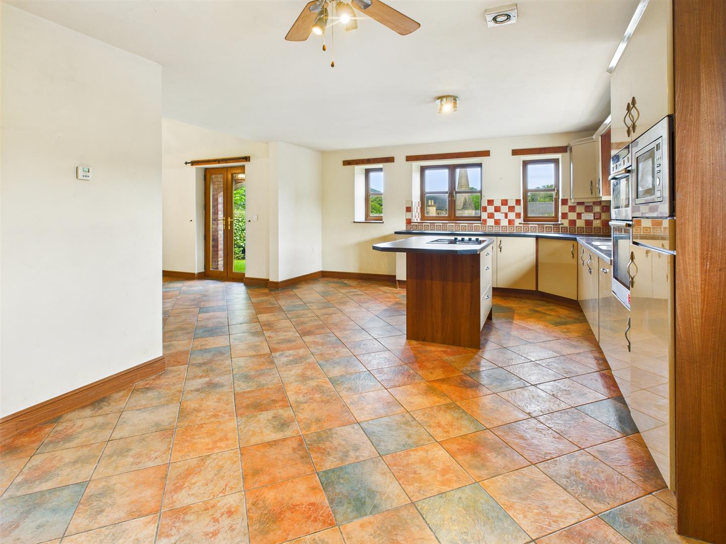 The kitchen area is fitted with a range of base cupboards with work surfaces over, matching eye level cupboards, twin bowl stainless steel sink with mixer tap and drainers to either side, part tiled walls, integrated double oven with cupboards above and below, fridge, microwave and dishwasher, central island with a 4 ring hob and drawers below, 2 windows to the front and 3 to the side and tiled floor. Opening to the family room - brick fireplace with inset log burner and French doors to both sides.