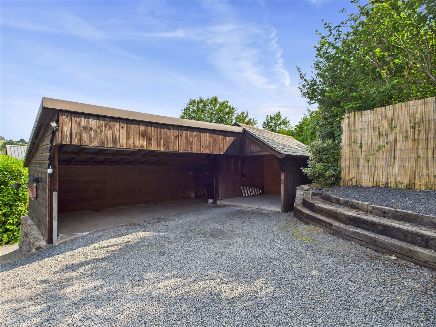 With power and light and storage to the end. Door to the side gardens.