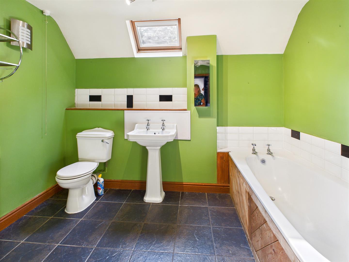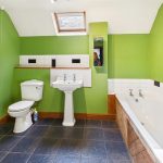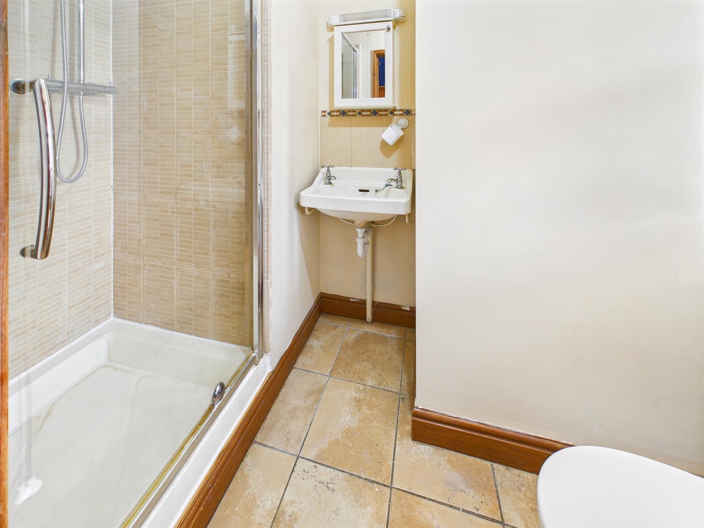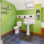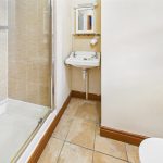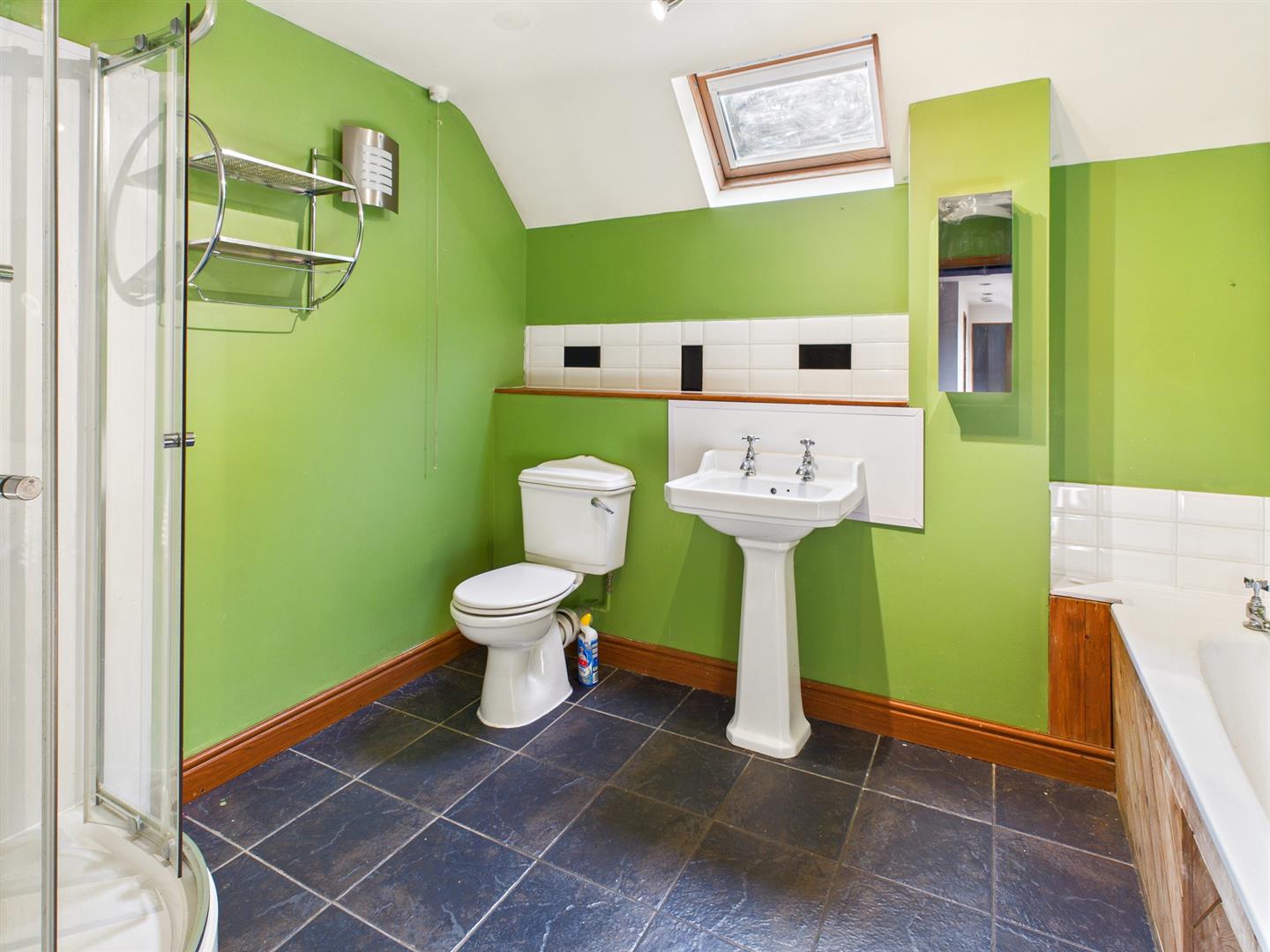 Wood panelled bath with tiled splashback, pedestal wash hand basin, low level W.C., corner shower cubicle, tiled floor, double glazed Velux window, heated towel rail and built in storage recess.