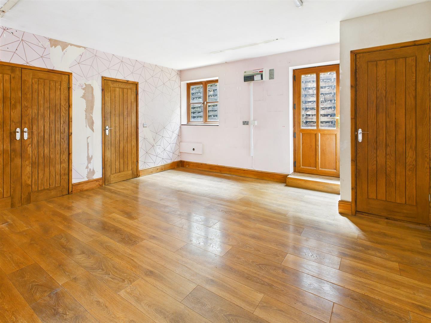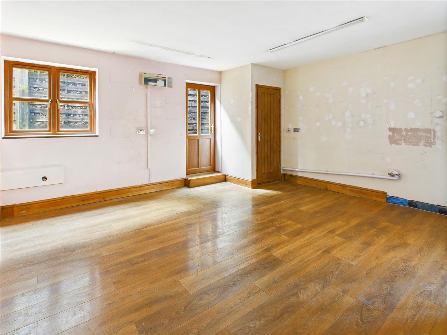 Wood effect flooring, built in double cupboard, cupboard housing the boiler with shelving over. Composite door to the side and door to:
