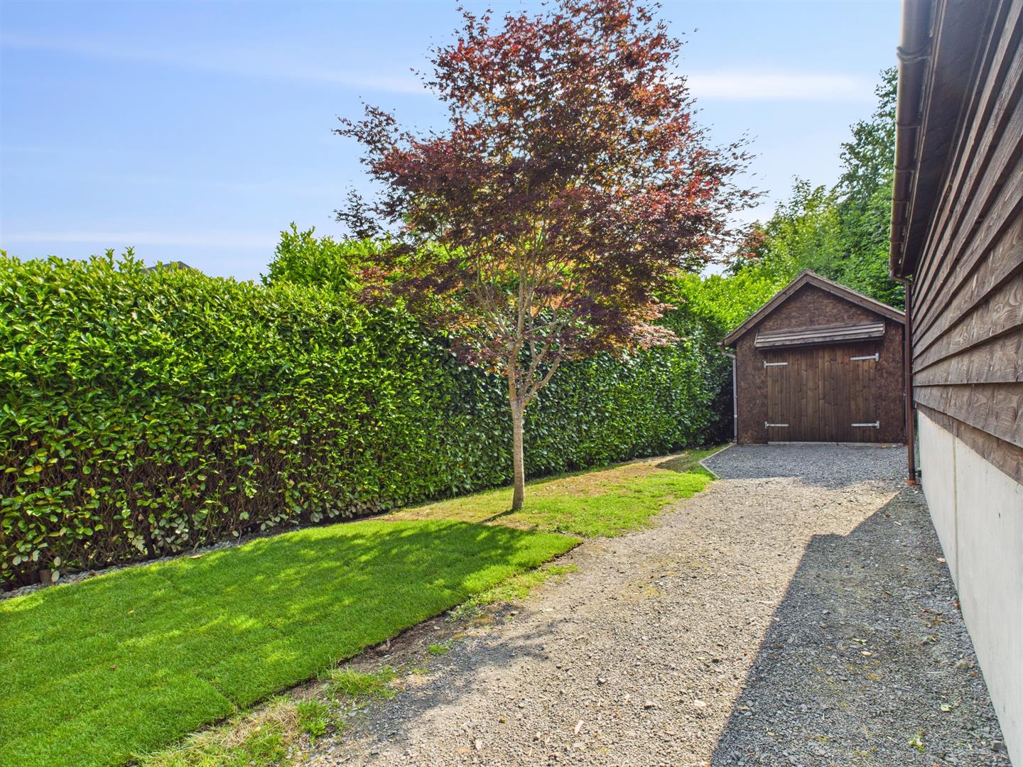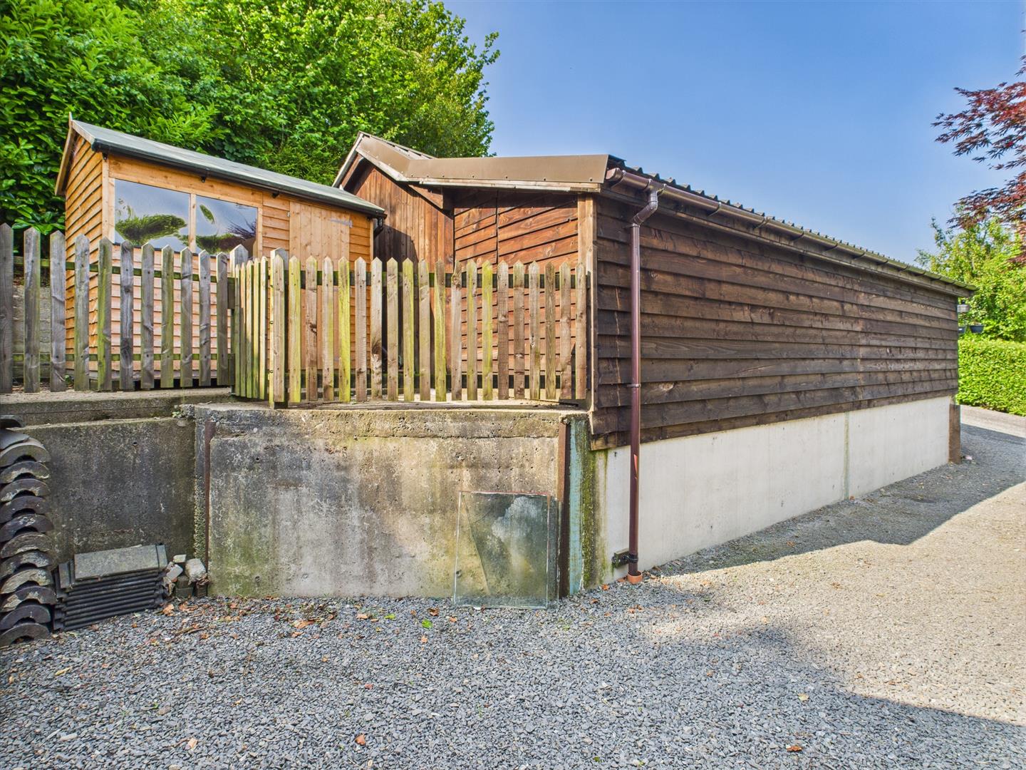 Gravel driveway leading to a WORKSHOP- power and light, twin doors to the front, work bench and personal door to the side. Area laid to grass. Steps up to a GARDEN SHED.