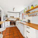 A well appointed space with a range of units incorporating sink with mixer taps set into worksurface. Further range of matching base units comprising cupboards and drawers with space for dishwasher. Gas hob with extractor hood and single oven. Range of eye level wall units. Tiled flooring, window to rear and door leading to pantry with space for fridge freezer.