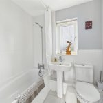 With panelled bath with with shower attachment over, wash hand basin and WC. Complementary tiled surrounds, heated towel rail, window to the rear.
