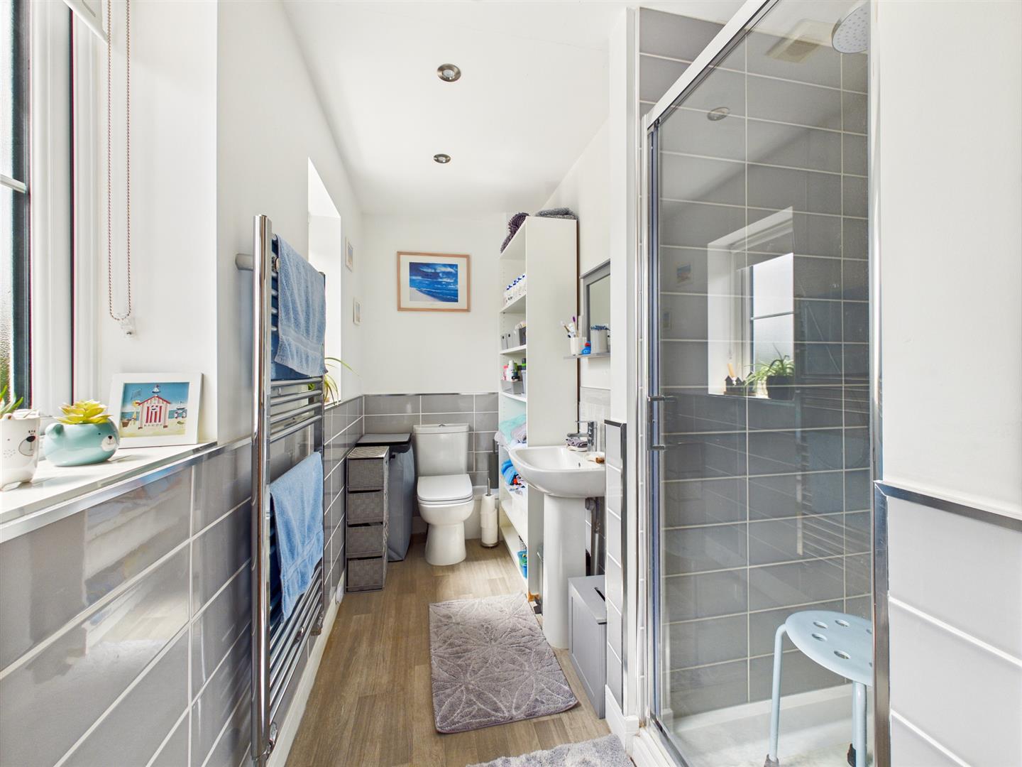 With low flush w.c. pedestal sink with a tiled splashback, shower unit with a fully tiled surround, extractor fan, and a stainless-steel towel rail. Window to front.