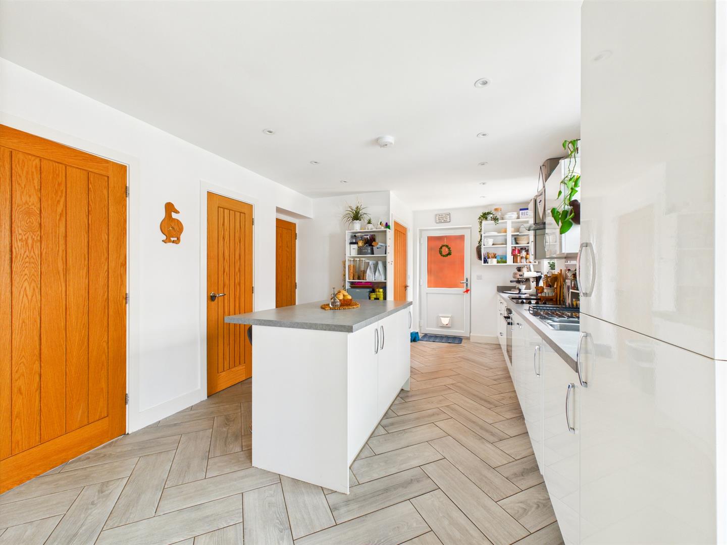Rear aspect window, door to garden, built-in base units with a gloss finish, laminated worktops and 1 1/2 drainer sink with draining space. Integral appliances include a fridge/freezer, electric oven, a four-ring ceramic hob, washing machine and dishwasher. Island unit with breakfast bar seating space. Radiator and deep storage cupboard. French doors give access to conservatory.