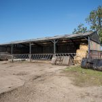 11. Steel portal framed livestock building - 4 bays, asbestos corrugated sheeting roof, concrete floor, concrete block and metal sheeting walls to 3 sides, water connection.