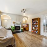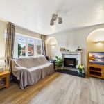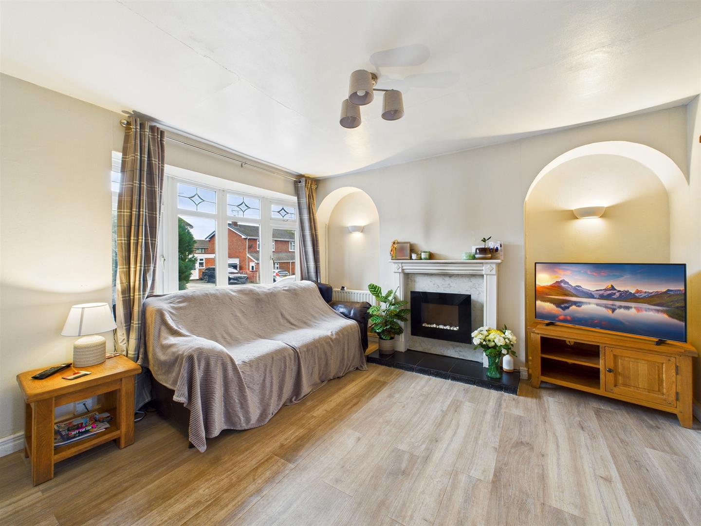 Light and airy room with uPVC window to the front, electric fire, two radiators, wood effect flooring, TV/telephone points, and door to: