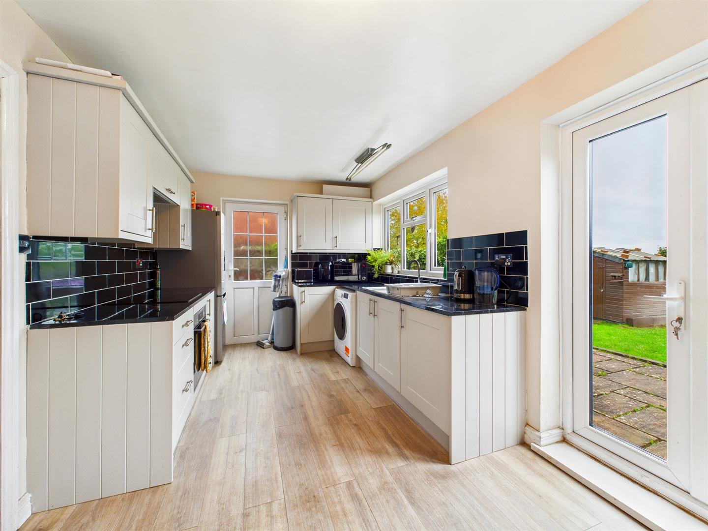 Modern fitted Kitchen comprising a range of wall and base units with granite effect worktops over and inset stainless steel sink with mixer tap and drainer. Integrated Bosch oven with hob and extractor hood over. Space/plumbing for fridge freezer and washing machine. Continuation of wood effect flooring, part tiled walls, radiator, understairs storage cupboard and glazed uPVC doors to rear gardens.