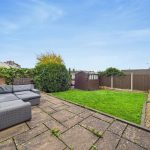 A pedestrian gate provides access to the rear where a paved patio adjoins the property with lawned gardens beyond bordered by timber fencing and gravelled beds.