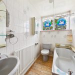 Fitted with low flush WC and wash hand basin with tiled surround. Window to side.