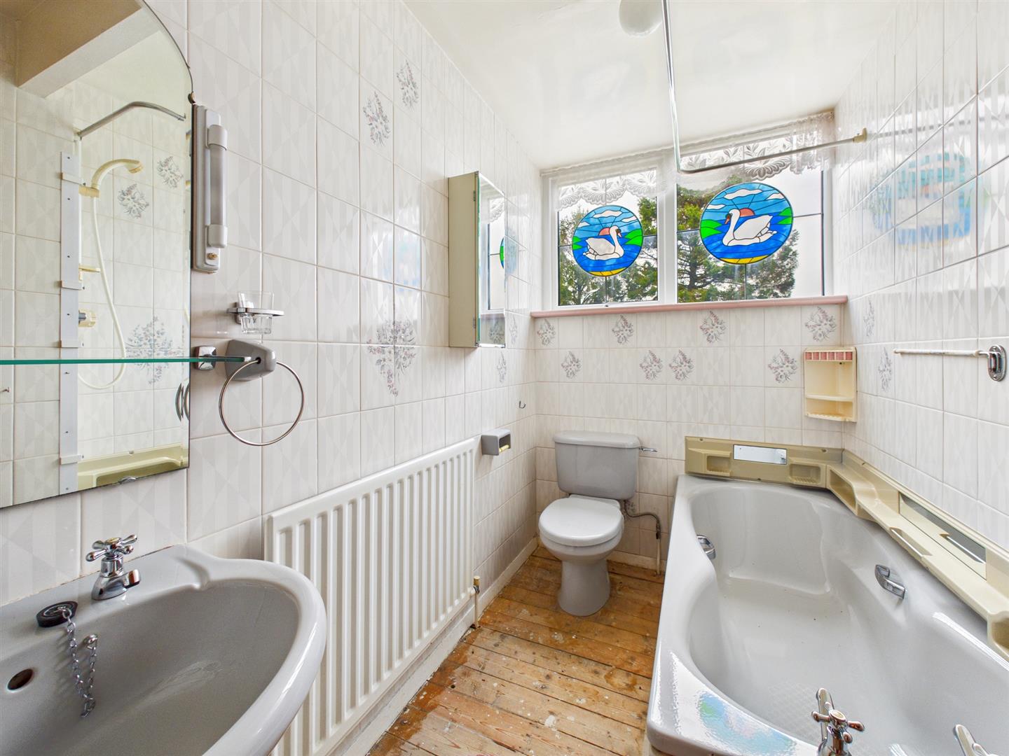 Fitted suite comprising panelled bath, wash hand basin and WC, tiled walls and window to rear.