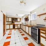 With range of units comprising one and a half bowl drainer sink unit set into wood effect laminate work surfaces, range of cupboards and drawers under. Space for slot in cooker. Matching range of eye level units. Tile splash to worksurfaces. Tile flooring, radiator, windows to rear. Glazed and wooden door lead to.