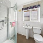 With suite comprising corner shower tray with sliding doors and shower unit, wash hand basin and WC. Complementary tiled surrounds, Upvc double glazed window to the side.