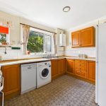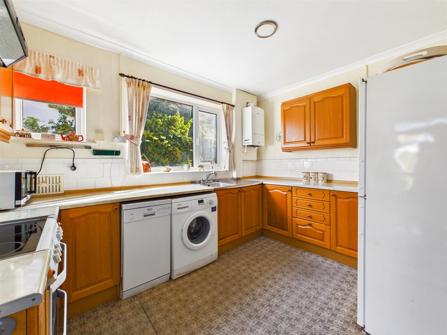 With range of units comprising single drainer sink unit set into work surfaces, range of cupboards and drawers under. Space for slot in cooker, dishwasher and washing machine. Matching range of eye level units and housing gas central heating boiler. Tile splash to walls, radiator, windows to side.