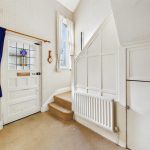 With stain glass window to front, radiator, deep understairs storage cupboard. Door to